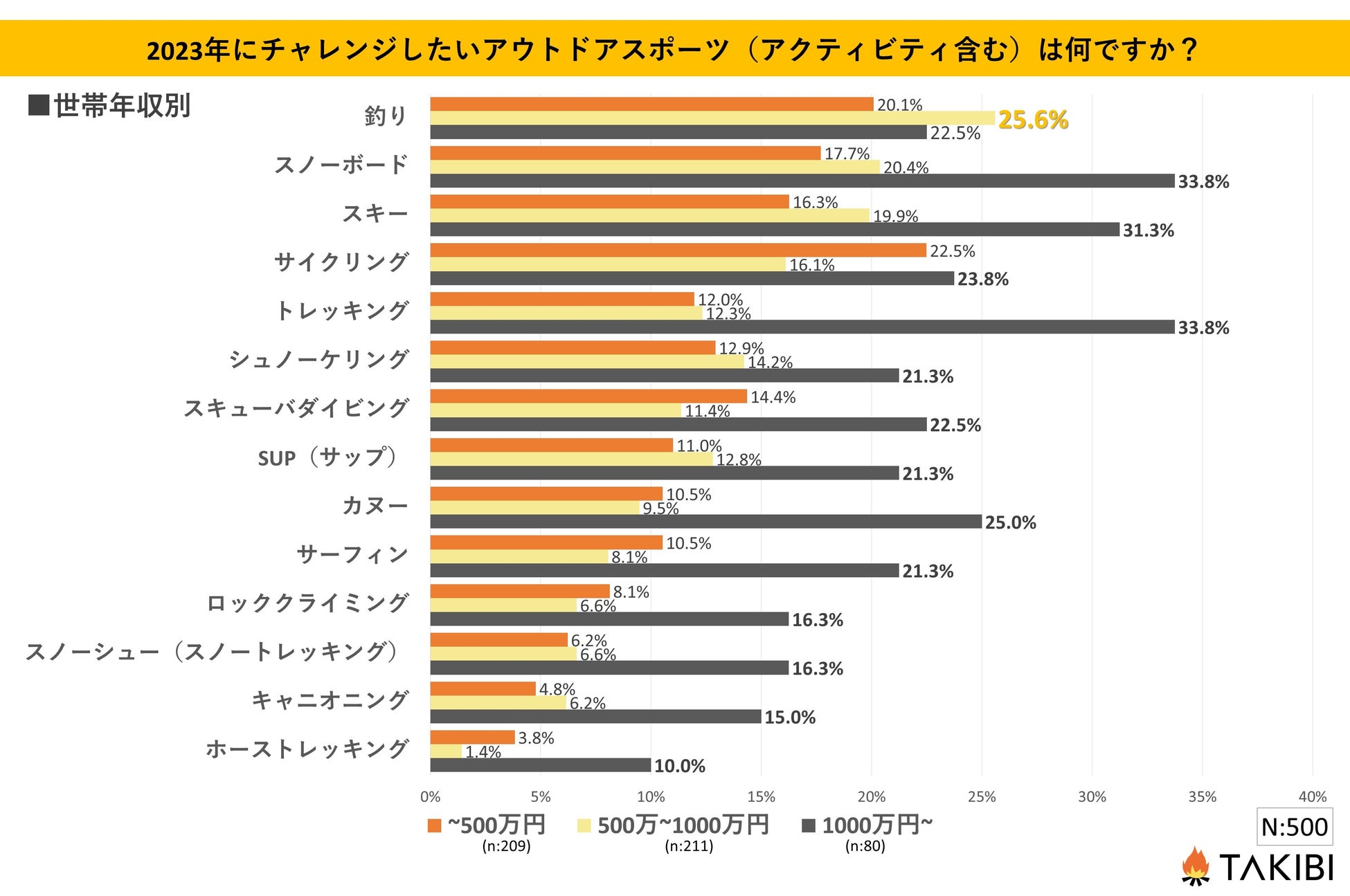 以前行った「あなたはアウトドアスポーツ(アクティビティを含む)をしていますか?」というアンケート(https://www.takibi-reservation.style/media/fieldreport/chubu/64876/#t1)では、実際にアウトドアスポーツをされている方も世帯年収1,000万円~の方に多いという結果になりました。仕事仲間や友人が楽しんでいる姿を見て影響を受け、今年こそは挑戦したいと思っている方が多いのかもしれません。