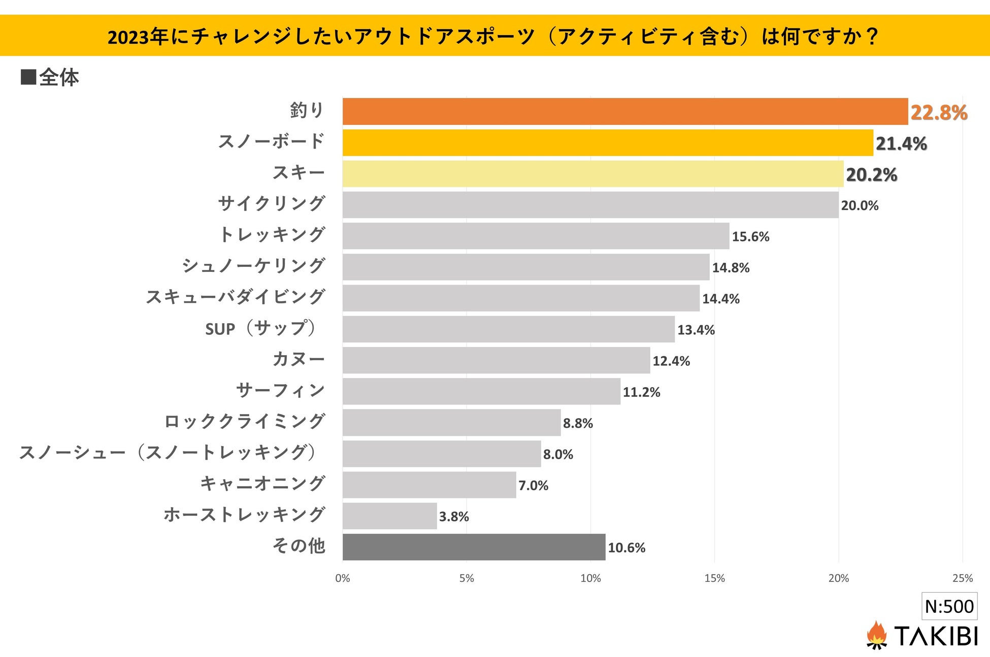 全国の10代~60代の男女を対象とした「2023年にチャレンジしたいアウトドアスポーツ(アクティビティ含む)は何ですか?」というアンケートを行ったところ、最も多かった回答は「釣り」で22.8%という結果になりました。次いで、「スノーボード」が21.4%、「スキー」が20.2%となっております。