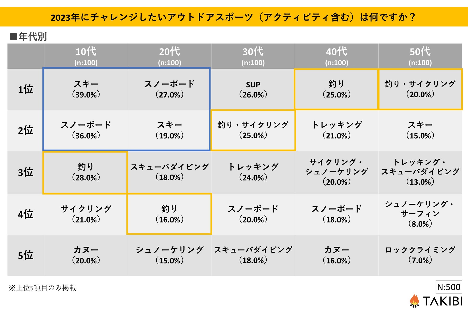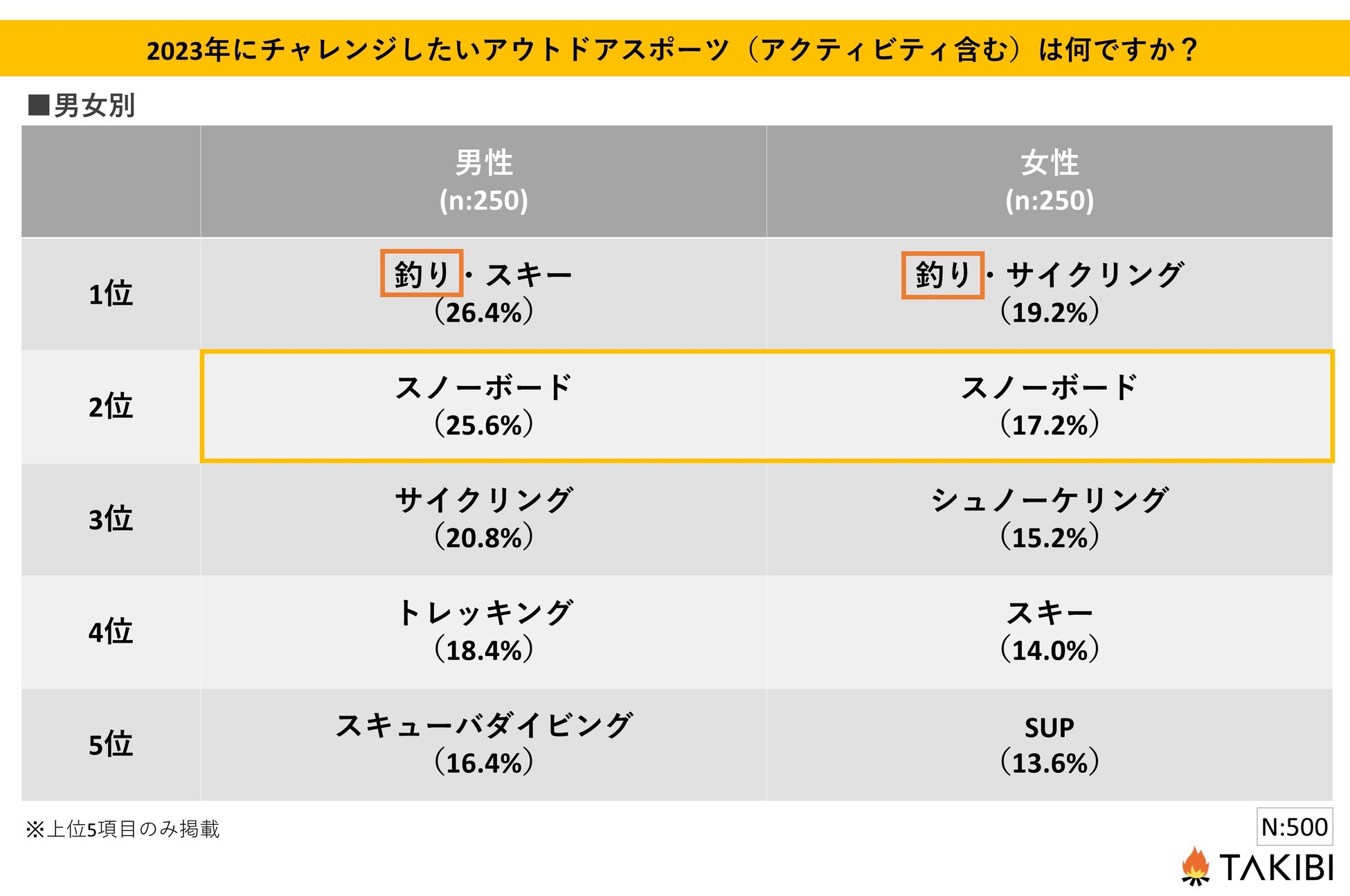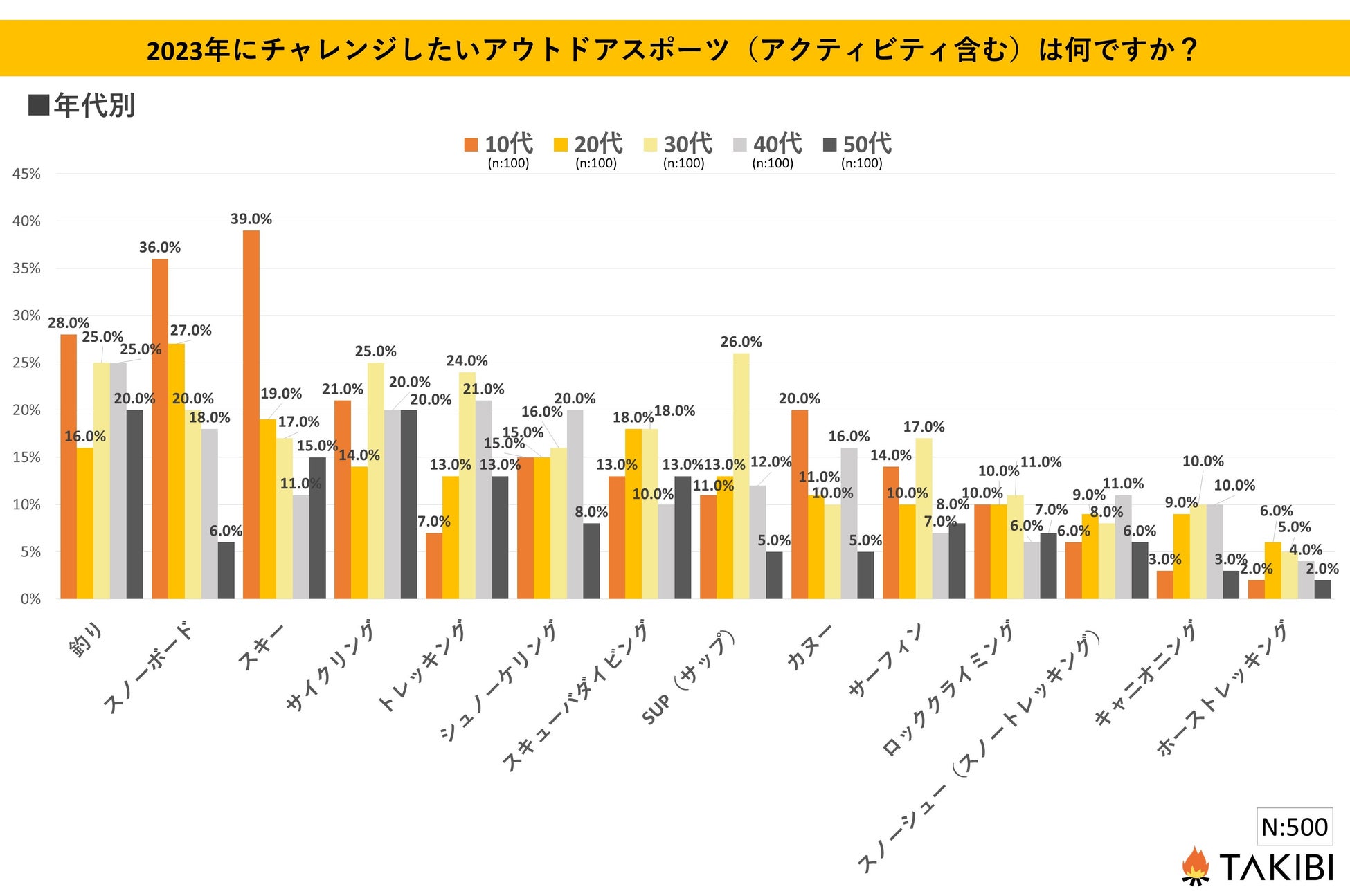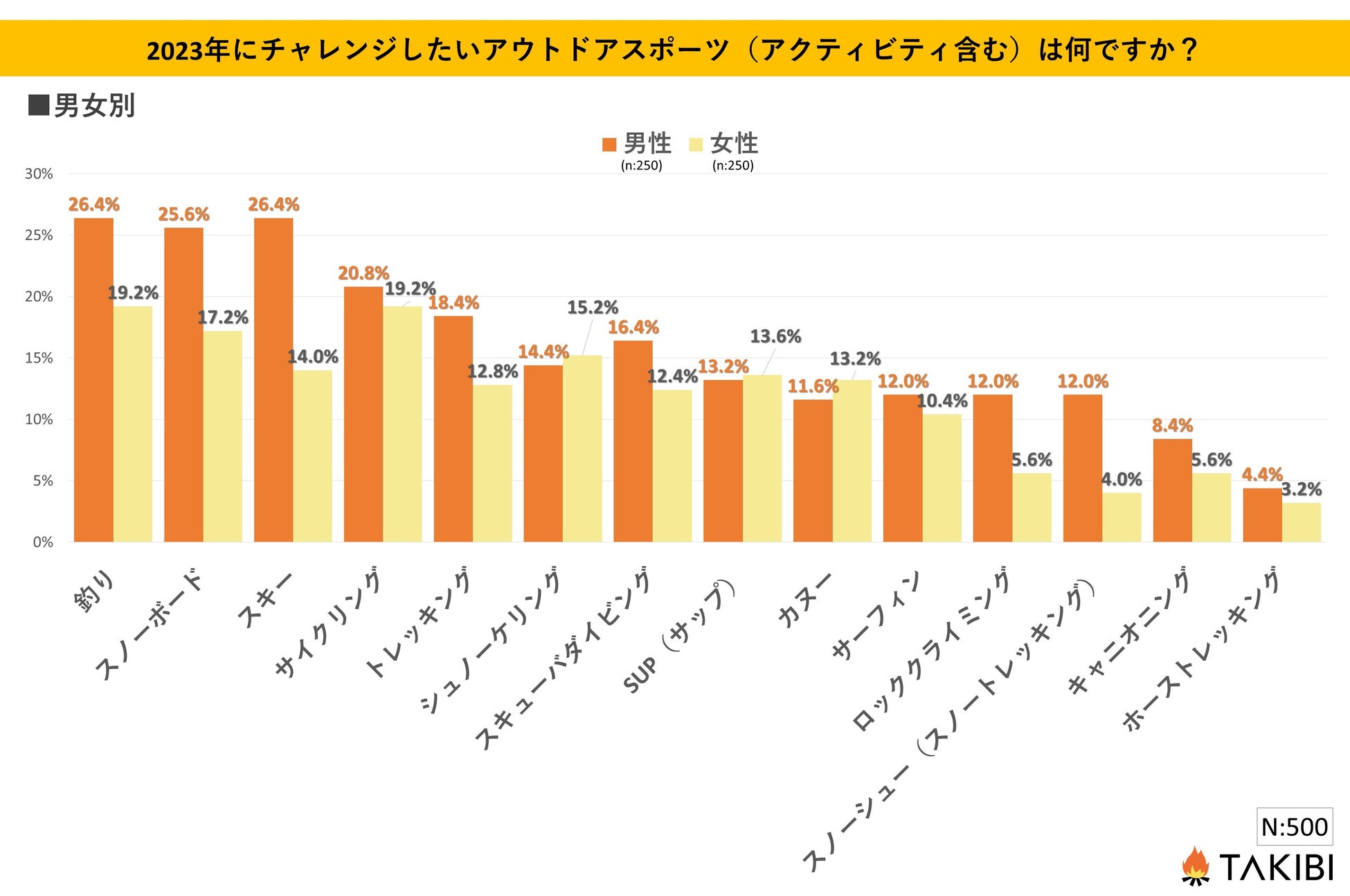 キャンプやグランピングを中心としたアウトドア総合情報サイト「TAKIBI」の運営をおこなう株式会社フォーイットは、全国の10代~50代までの男女500人を対象にチャレンジしたいアウトドアスポーツ・アクティビティに関するアンケートを実施し、男女別・年代別等の特徴についてまとめました。