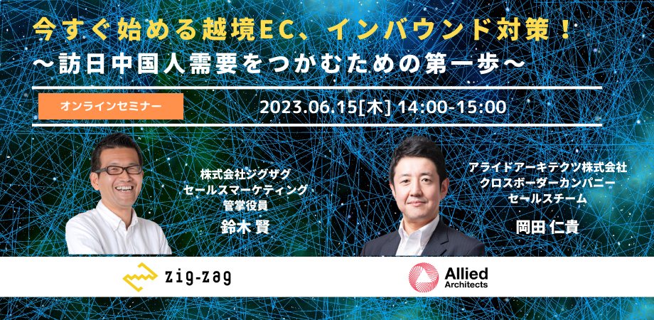 本セミナーでは、独自のインフルエンサーネットワークを活用した中国向け越境プロモーション支援を提供する「アライドアーキテクツ」から、クロスボーダーカンパニーセールスチームの岡田仁貴氏をゲストにお招きし、「インバウンド対策~訪日中国人需要をつかむための第一歩」、ジグザグから取締役の鈴木賢が登壇し、自社サイトを用いた越境ECの手法として「ウェブインバウンド®︎ソリューション"WorldShopping BIZ"」をご紹介します。
