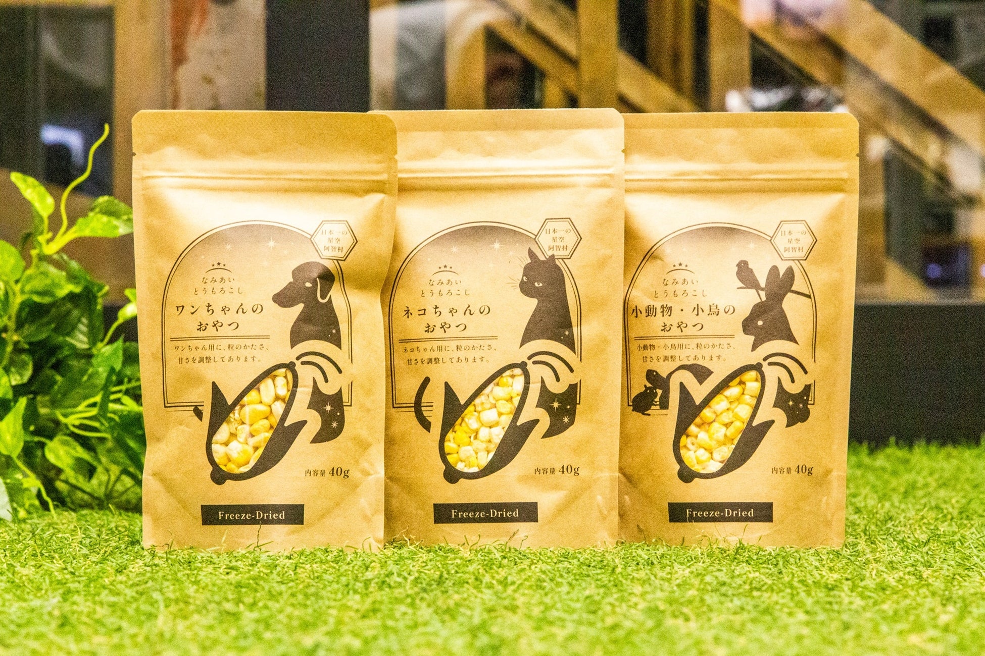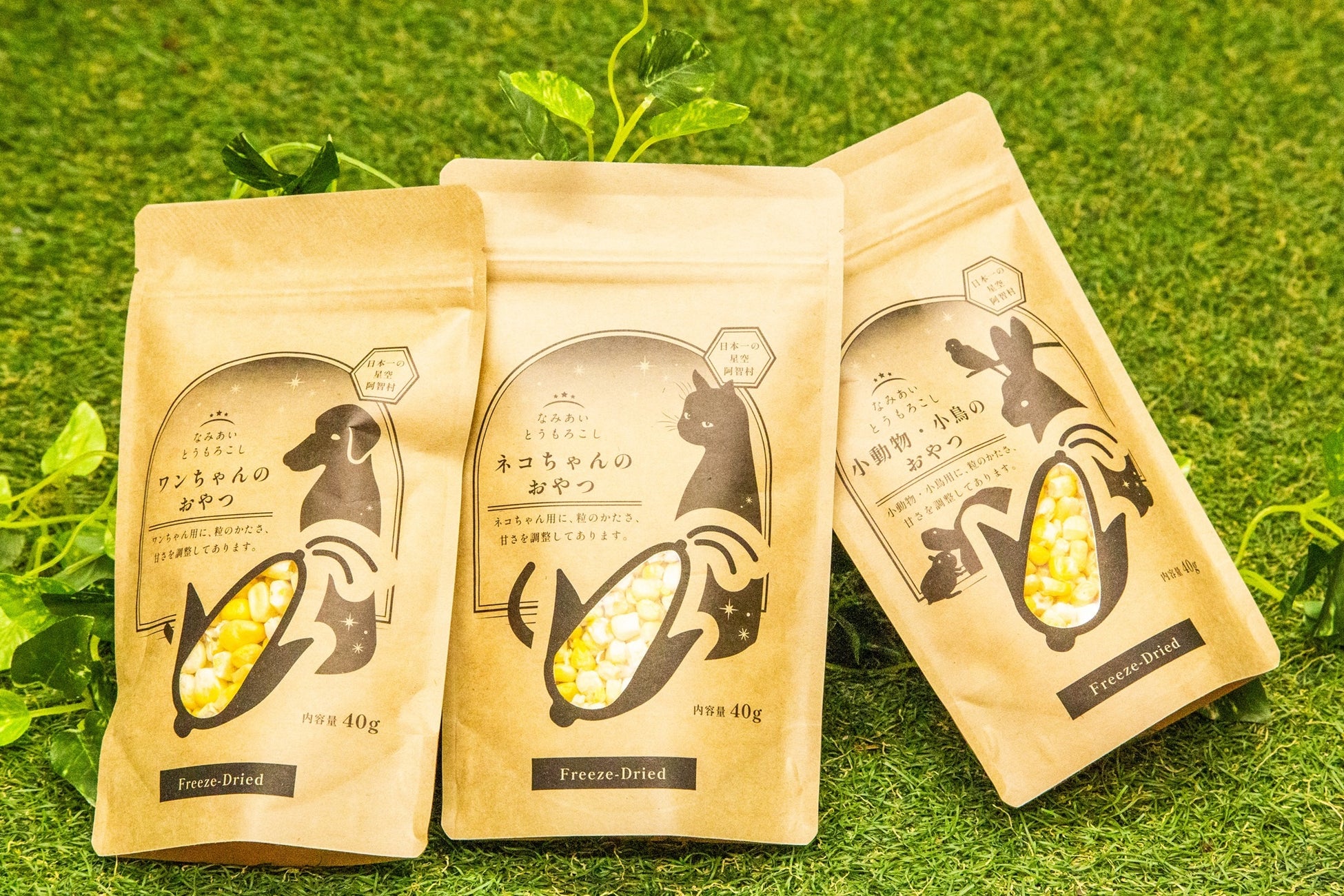 そんな美味しい「なみあい とうもろこし」の旬の美味しさを、そのままとじ込めたフリーズドライ商品です。「ワンちゃんのおやつ」、「ネコちゃんのおやつ」、「小動物・小鳥のおやつ」3種類をラインナップ。