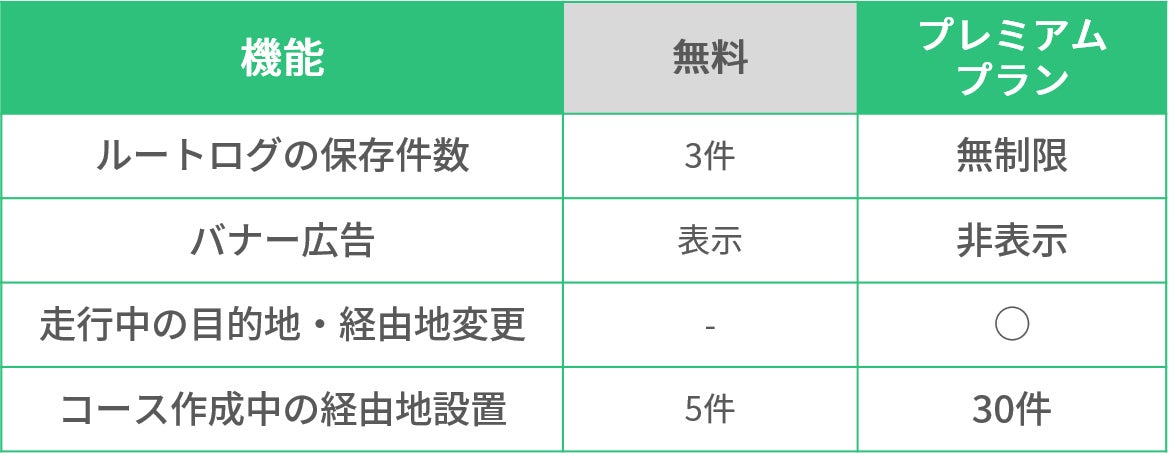 「プレミアムプラン」(月額250円 税込)は、ルートログの保存可能件数が無制限になるほか、走行中の目的地変更や経由地の追加、バナー広告なしの表示などが可能になる有料プランです。