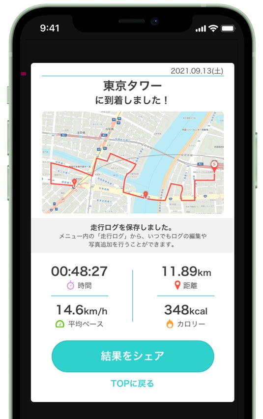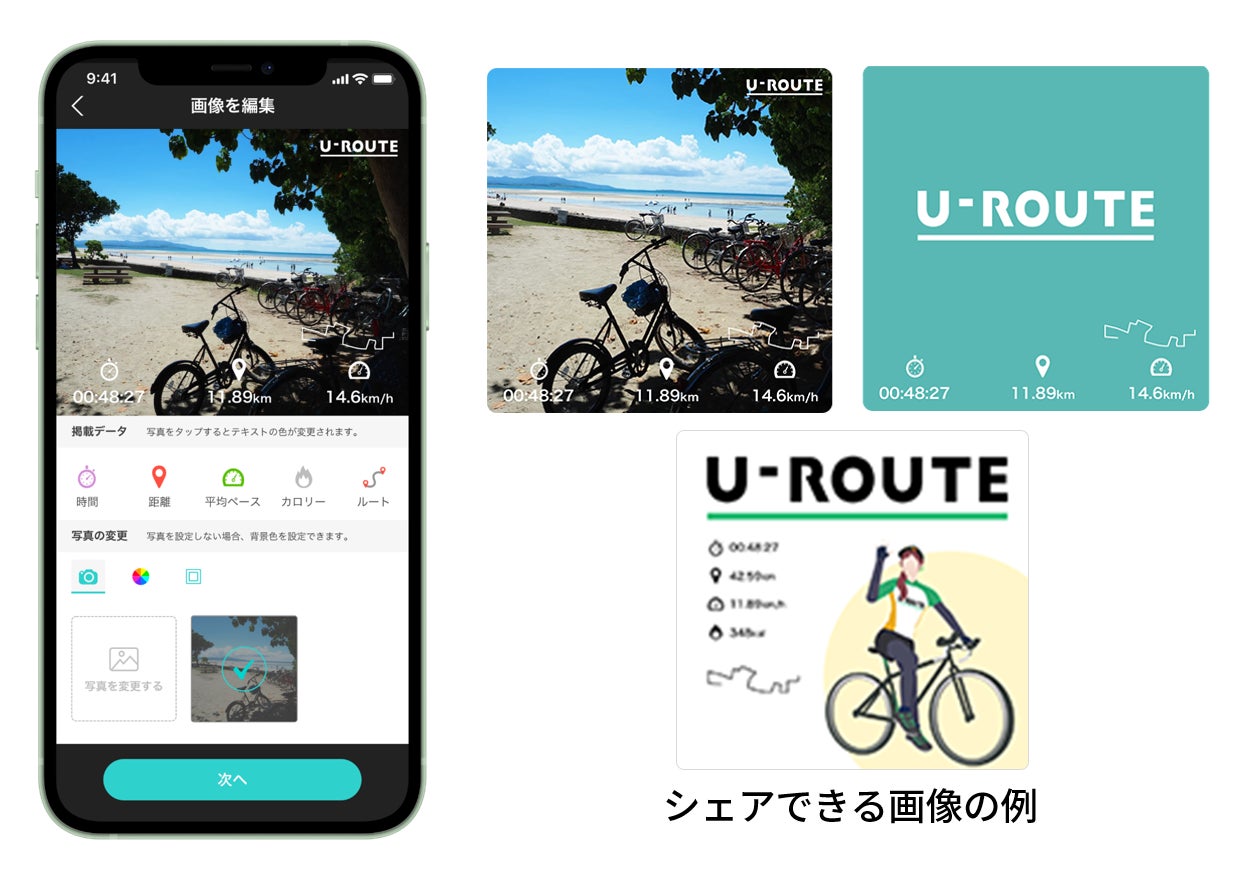 「ルートログ」機能は、U-ROUTEを使用して走行したルートを記録できる機能です。走行ルート以外にも、走行距離、走行時間、平均速度や推計消費カロリーを記録します。目的地に到着すると、これらの記録が地図画面と合わせて表示され、サイクリングで訪れた先の景色写真などと共に、簡単にSNSへ投稿することができます。