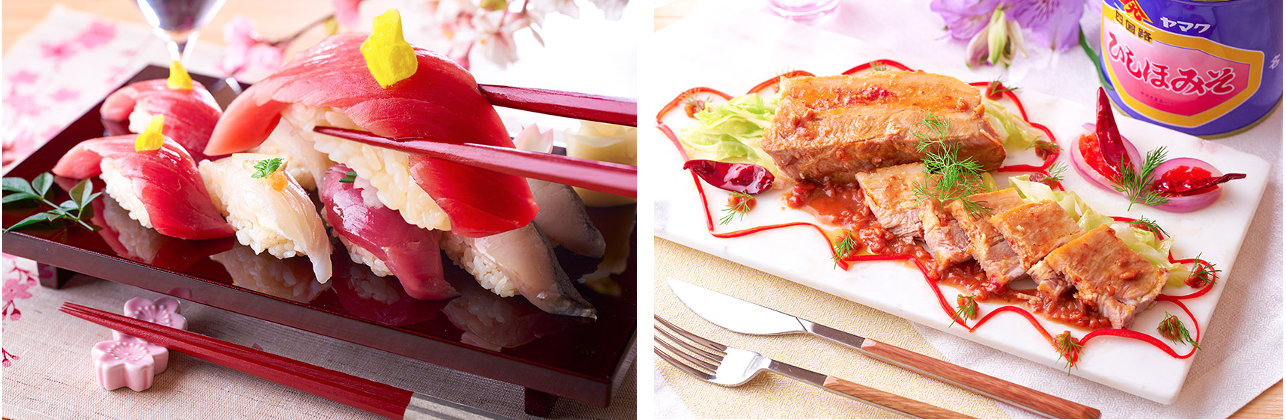 左:この春のイチオシメニュー「四国厳選ネタ握り寿司」。徳島県産の桜鯛、香川県名物・さわら、高知名物・カツオなど8種のネタの握り寿司は、ライブキッチンで職人が握りたてを提供します。愛媛や九州から直送される生本まぐろの握りもお見逃しなく。酸味がまろやかな赤酢を使った赤シャリを使用した、本格的な味わいです。
