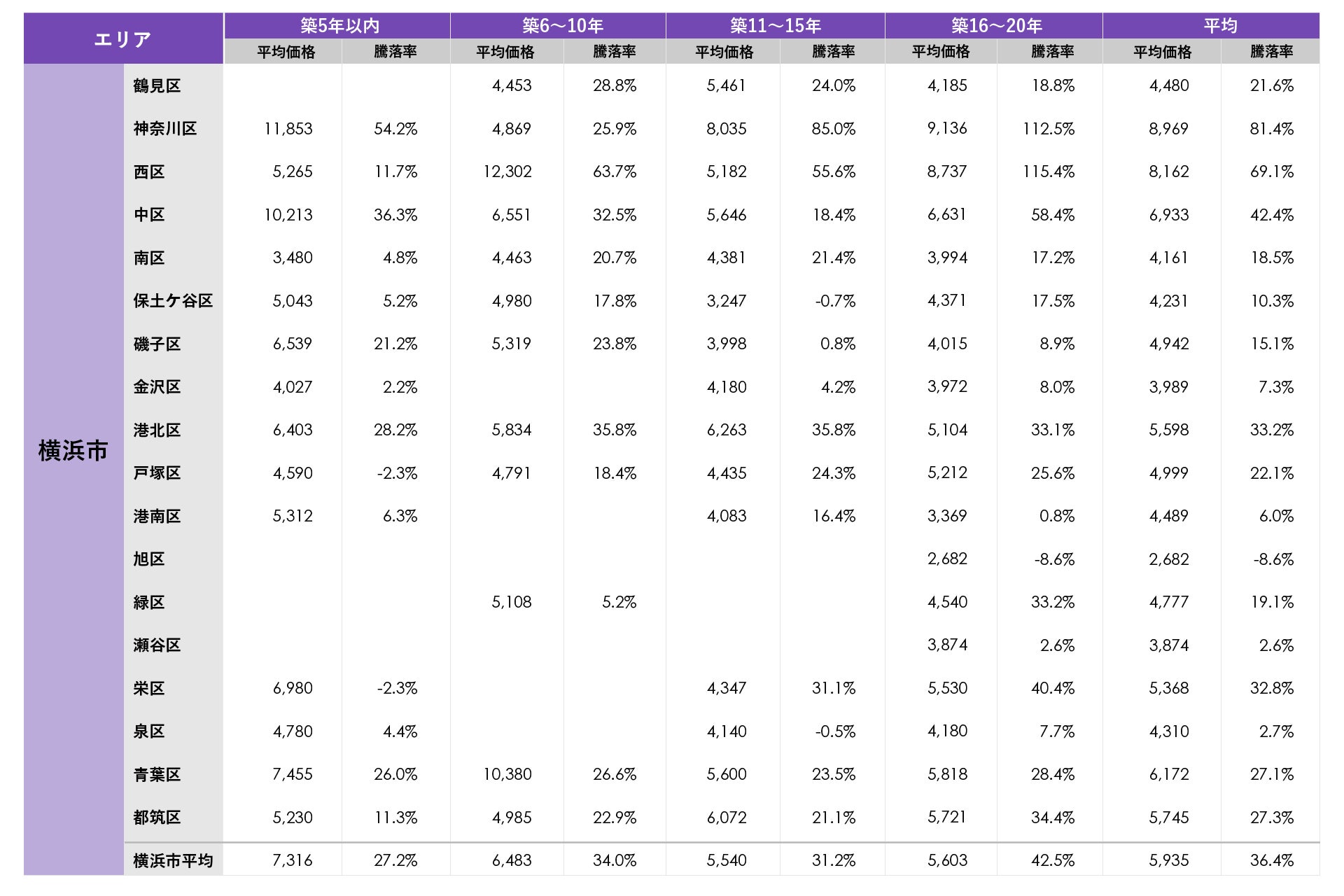 横浜市では、神奈川区の平均価格が最も高く8,969万円でした。平均騰落率も神奈川区が最も高く新築分譲時プラス81.4%で、横浜市で唯一80%を上回りました。神奈川区と中区の築5年以内、西区と青葉区の築6~10年で平均価格が1億円を上回りました。平均騰落率では神奈川区と西区の築16~20年で平均騰落率が110%を上回りました。
