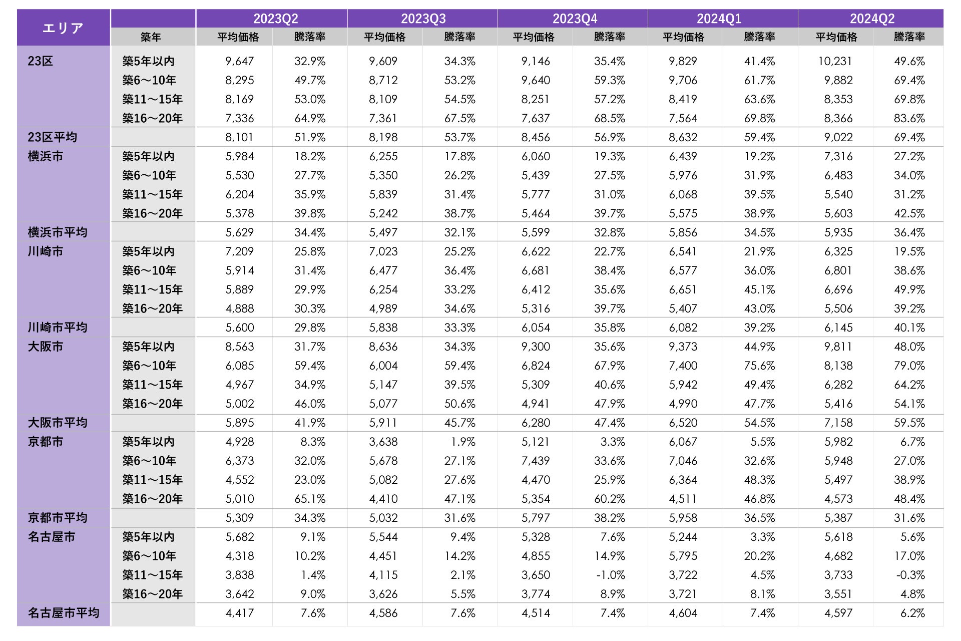 前年同期(2023年4~6月)比で平均価格と平均騰落率が最も上昇したのは大阪市でした。築年数別で最も騰落率が高かったのは東京23区の築16~20年で平均騰落率プラス83.6%、次いで大阪市の築6~10年でプラス79.0%でした。全体傾向としては、大阪市と名古屋市では築6~10年が、その他の地域では築11~15年と築16~20年の騰落率が高い傾向にあり、築5年以内は各エリア共に騰落率が低い傾向にあります。
