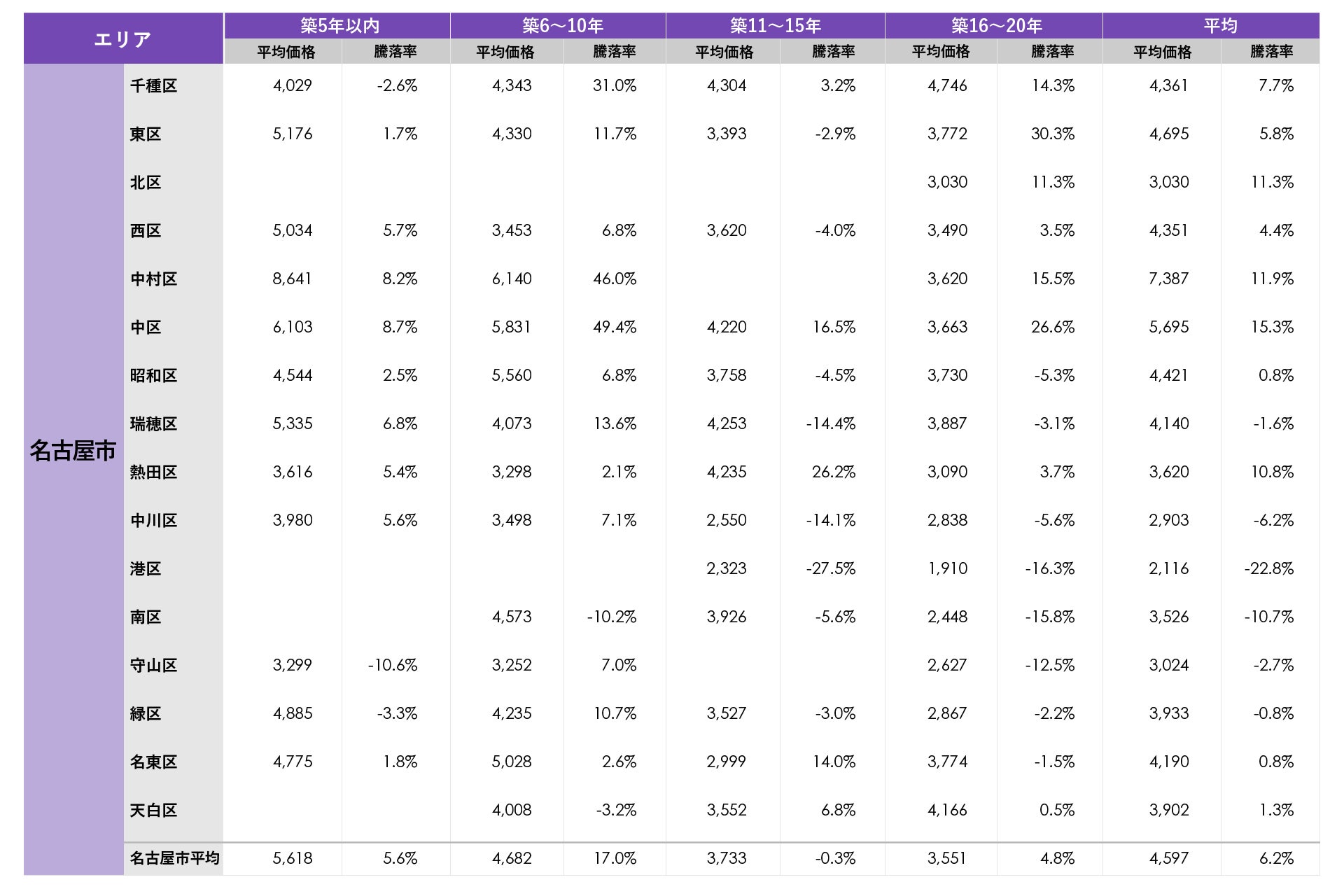 名古屋市では、最も高かった中村区で平均価格が7,387万円でした。平均騰落率が最も高かったのは中区で新築分譲時プラス15.3%でした。平均騰落率は中村区と中区の築6~10年で平均騰落率が40%を上回り、名古屋市の中で最も高い水準になっています。