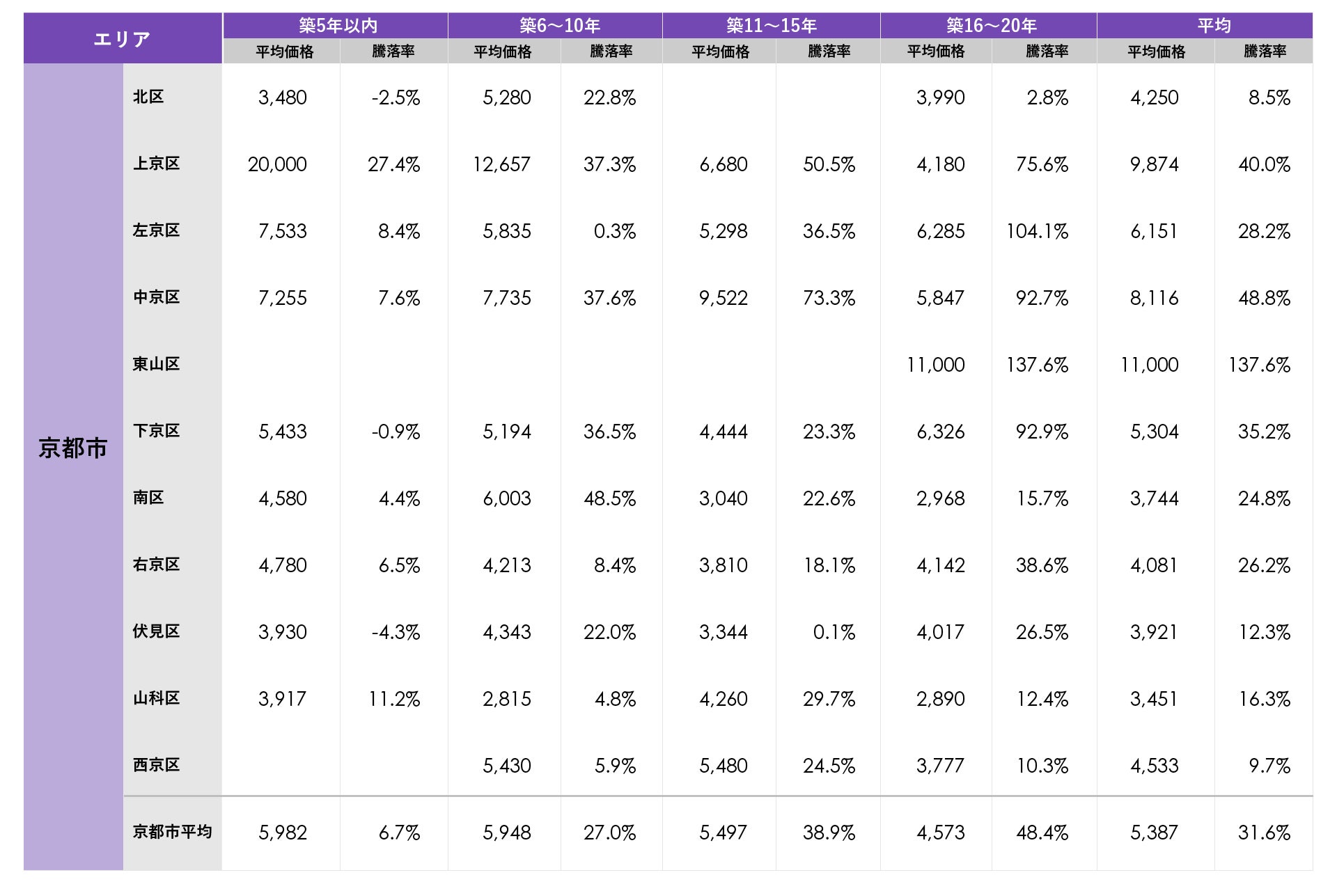 京都市では、東山区が前期に引き続き平均価格11,000万円で最も高くなりました。東山区を除くと上京区、中京区で平均価格が8,000万円を超えました。平均騰落率が最も高かったのは東山区の新築分譲時プラス137.6%でした。