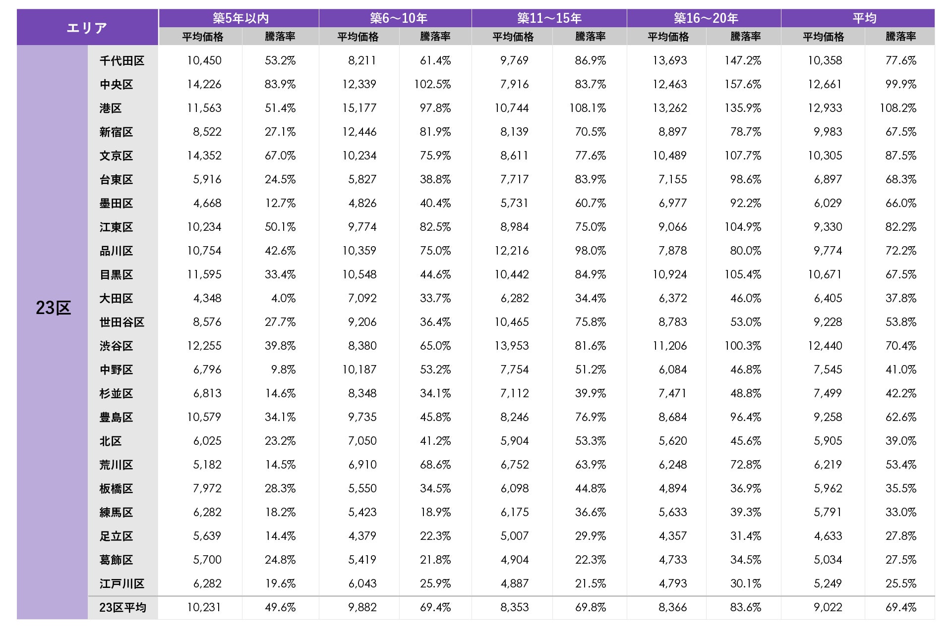 東京23区の平均価格は9,022万円で前期比プラス4.5%(プラス390万円)、前年同期比はプラス11.4%(プラス921万円)でした。流通した住戸の新築時からの平均騰落率はプラス69.4%で前期比プラス10ポイント、前年同期比プラス17.5ポイントとなりました。