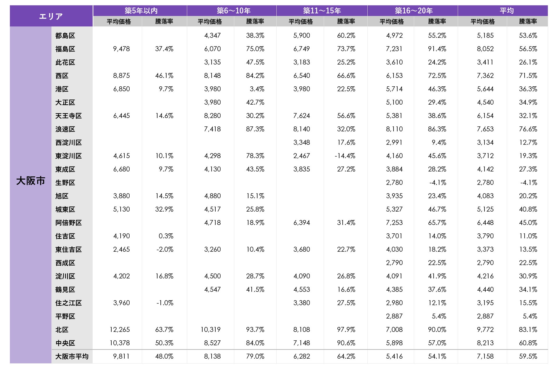 大阪市では、平均価格が最も高かった北区で9,000万円、2番目に高かった福島区で8,000万円を超えました。平均騰落率は北区の新築分譲時プラス83.1%が最も高く、福島区や浪速区でも同プラス70%を上回りました。大阪市では東京23区や横浜市、川崎市等と比べると築年の経過による平均価格の下落が大きい傾向が見られます。