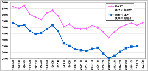 ※2「国税庁公表黒字申告割合」については、2006(H18)年までは、国税庁「会社標本調査結果」における数値を採用し、2008(H20)年以後は、同庁「法人税の申告事績の概要」における数値を採用しています。