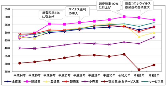 2021年の全産業の黒字企業割合は、前年の51.8%から1.9ポイント上昇しました。