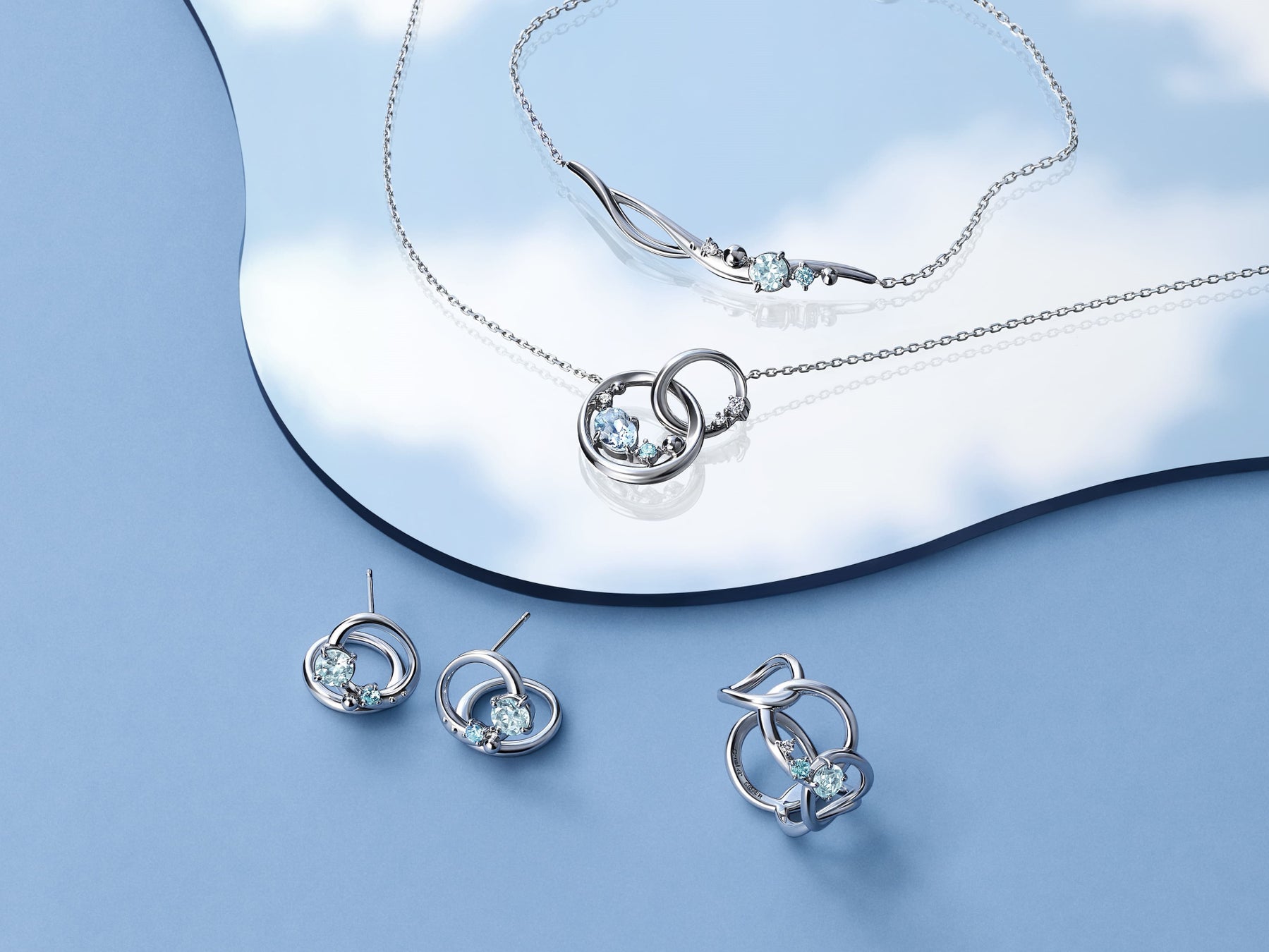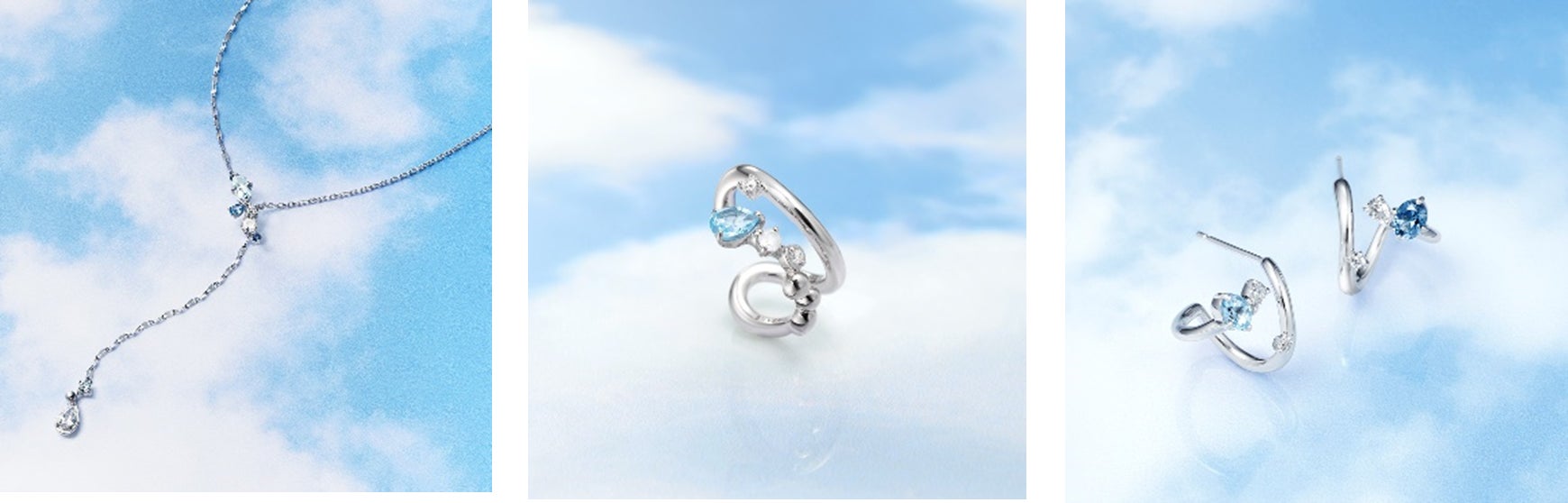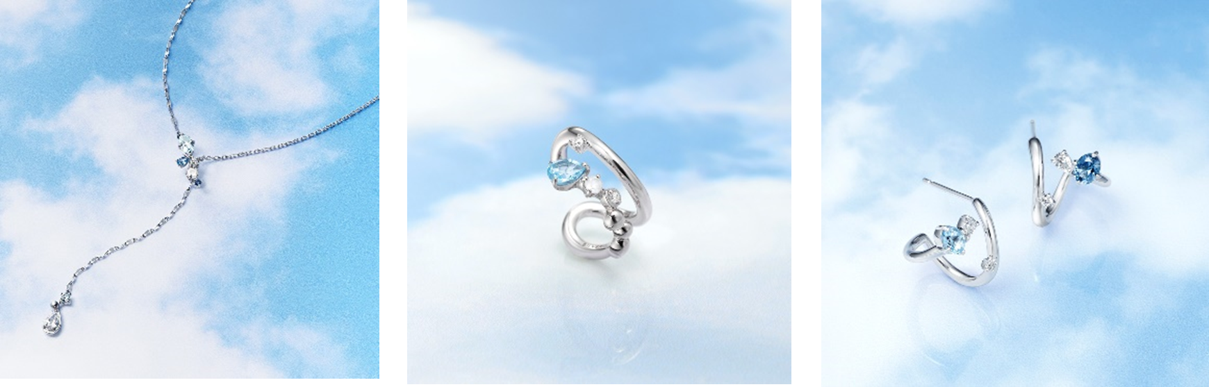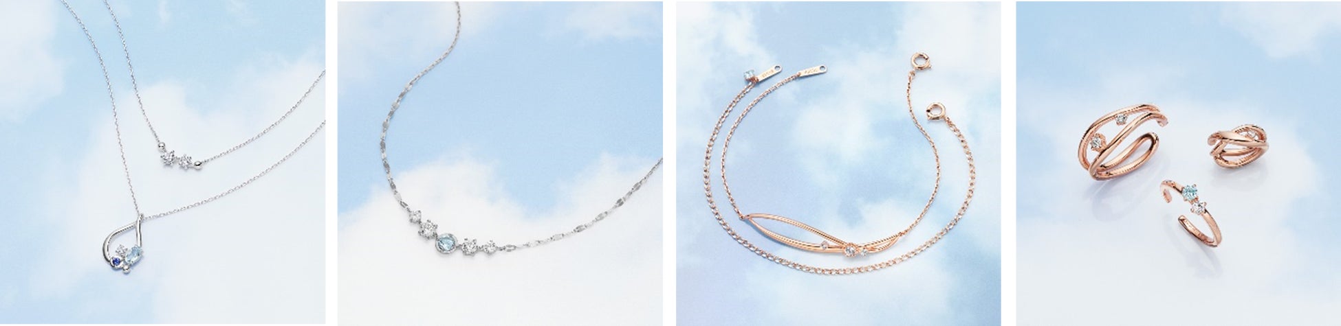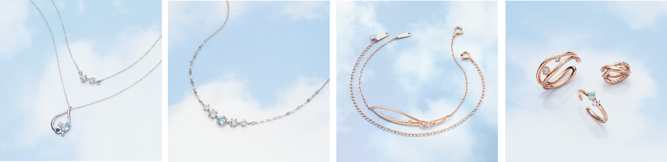 青い空に浮かぶ雲をスカイブルートパーズで表現したセットジュエリーから、海にきらめく水しぶきや水平線の輝きを模したネックレス、波の揺らめきを宿したブレスレットに、ピンクゴールドの地金にストーンが躍るリングカフ3点セットなど、夏のシーンを思わせる爽やかなジュエリーが揃います。