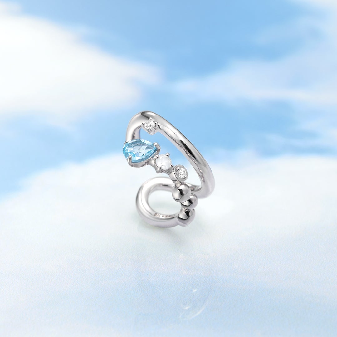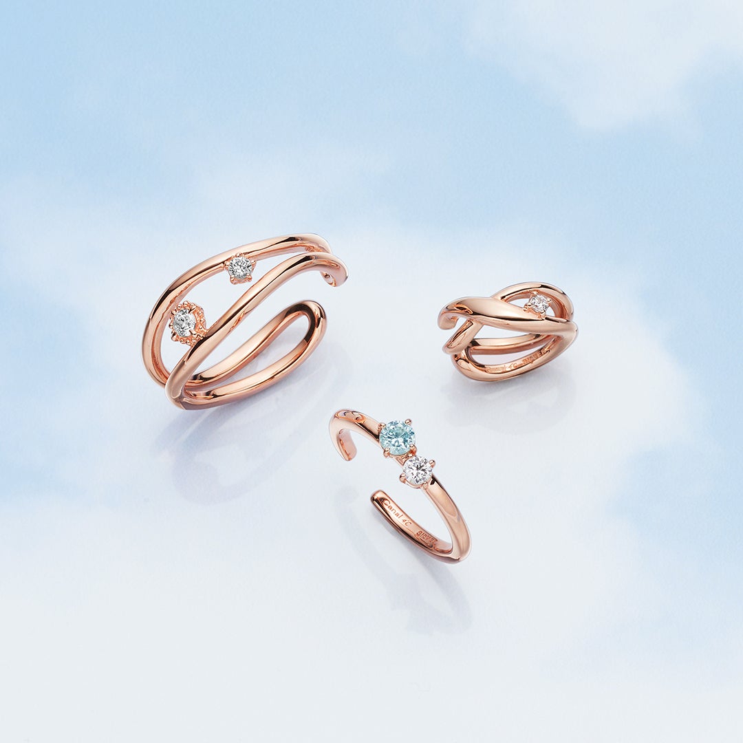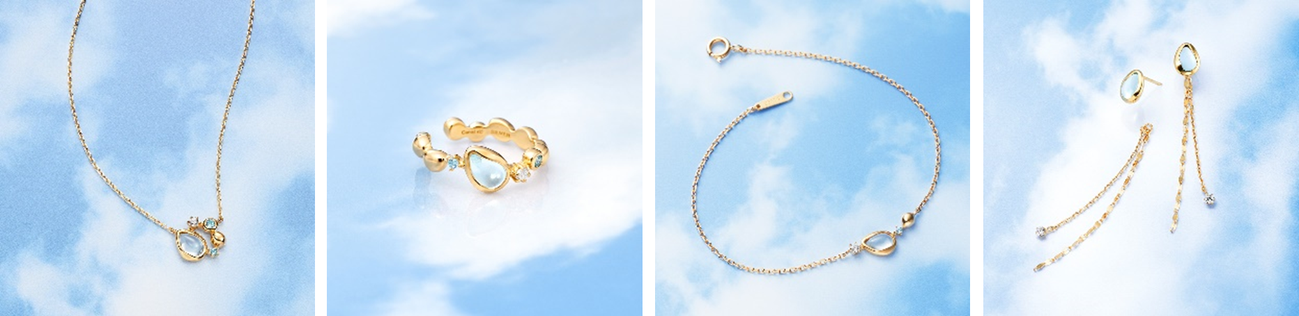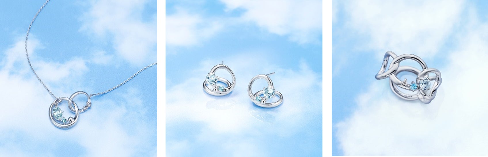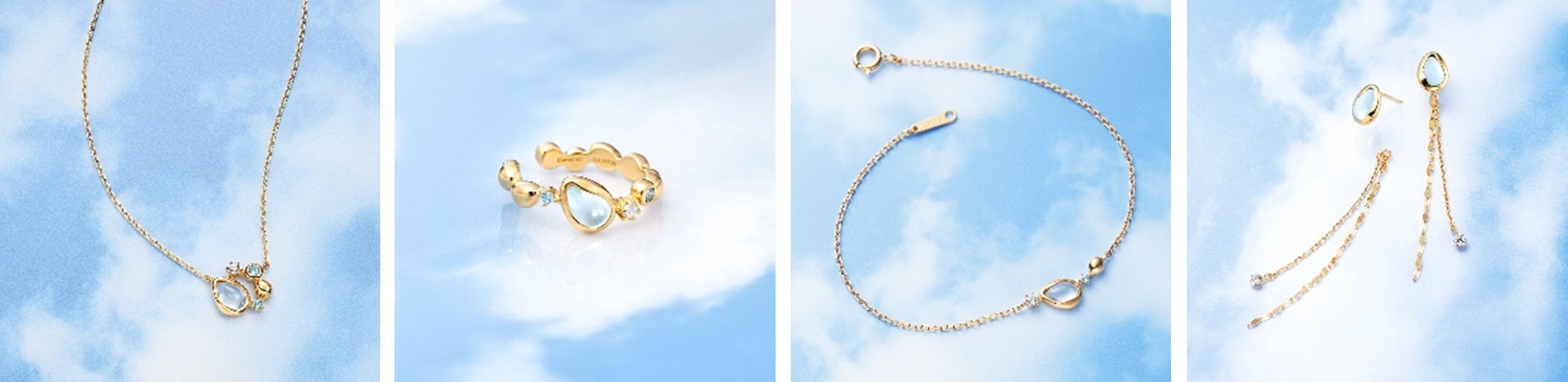 青い空に浮かぶ雲をスカイブルートパーズで表現したセットジュエリーから、海にきらめく水しぶきや水平線の輝きを模したネックレス、波の揺らめきを宿したブレスレットに、ピンクゴールドの地金にストーンが躍るリングカフ3点セットなど、夏のシーンを思わせる爽やかなジュエリーが揃います。