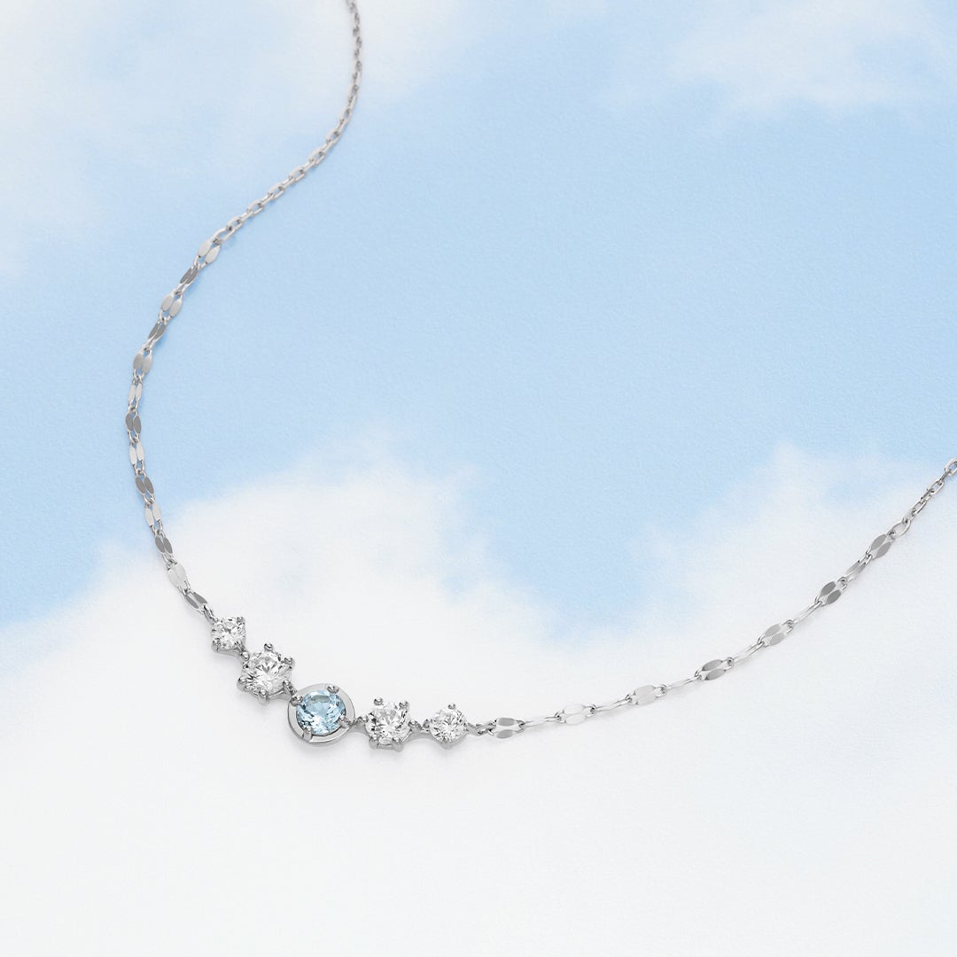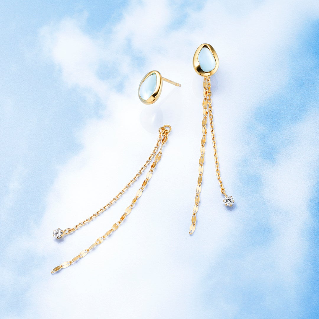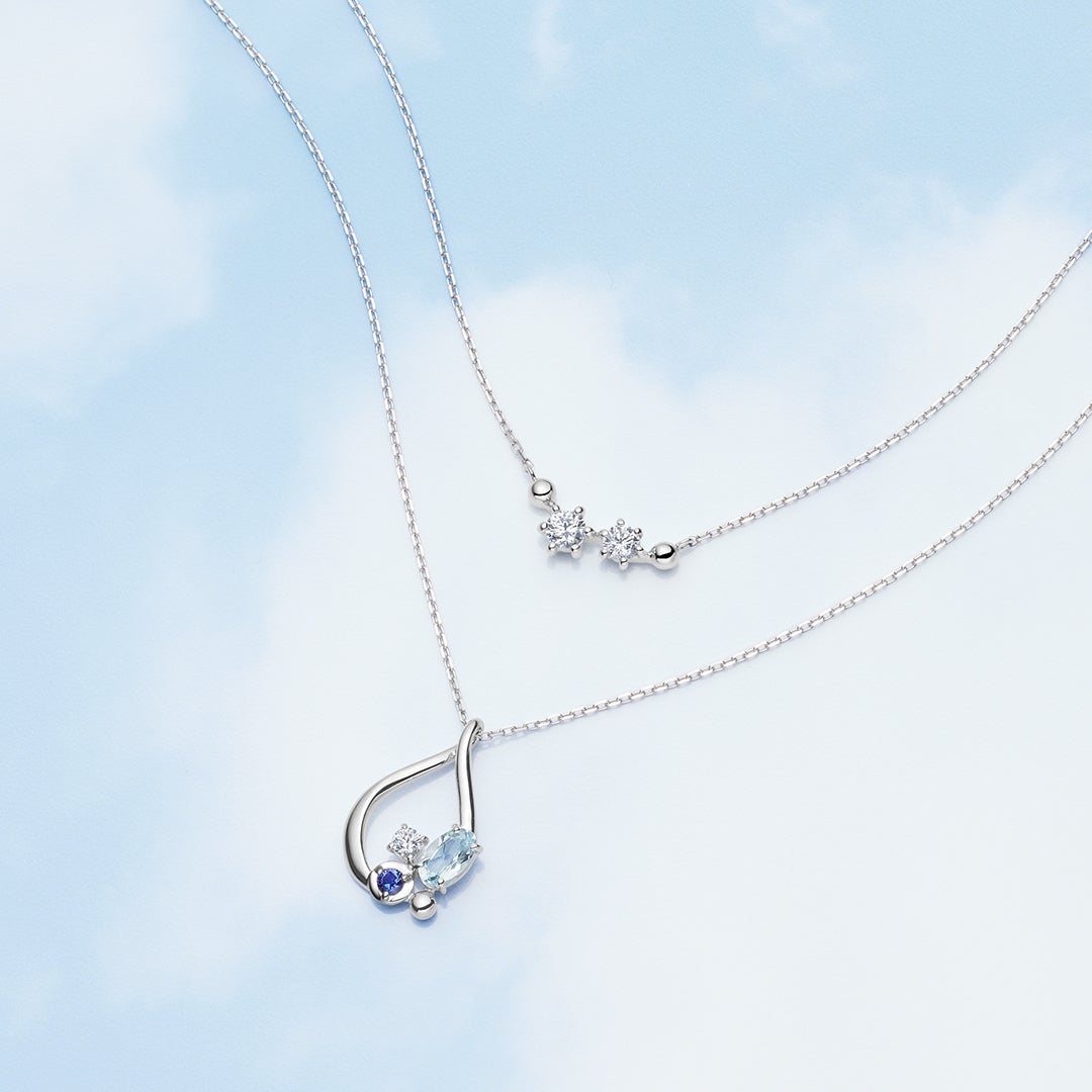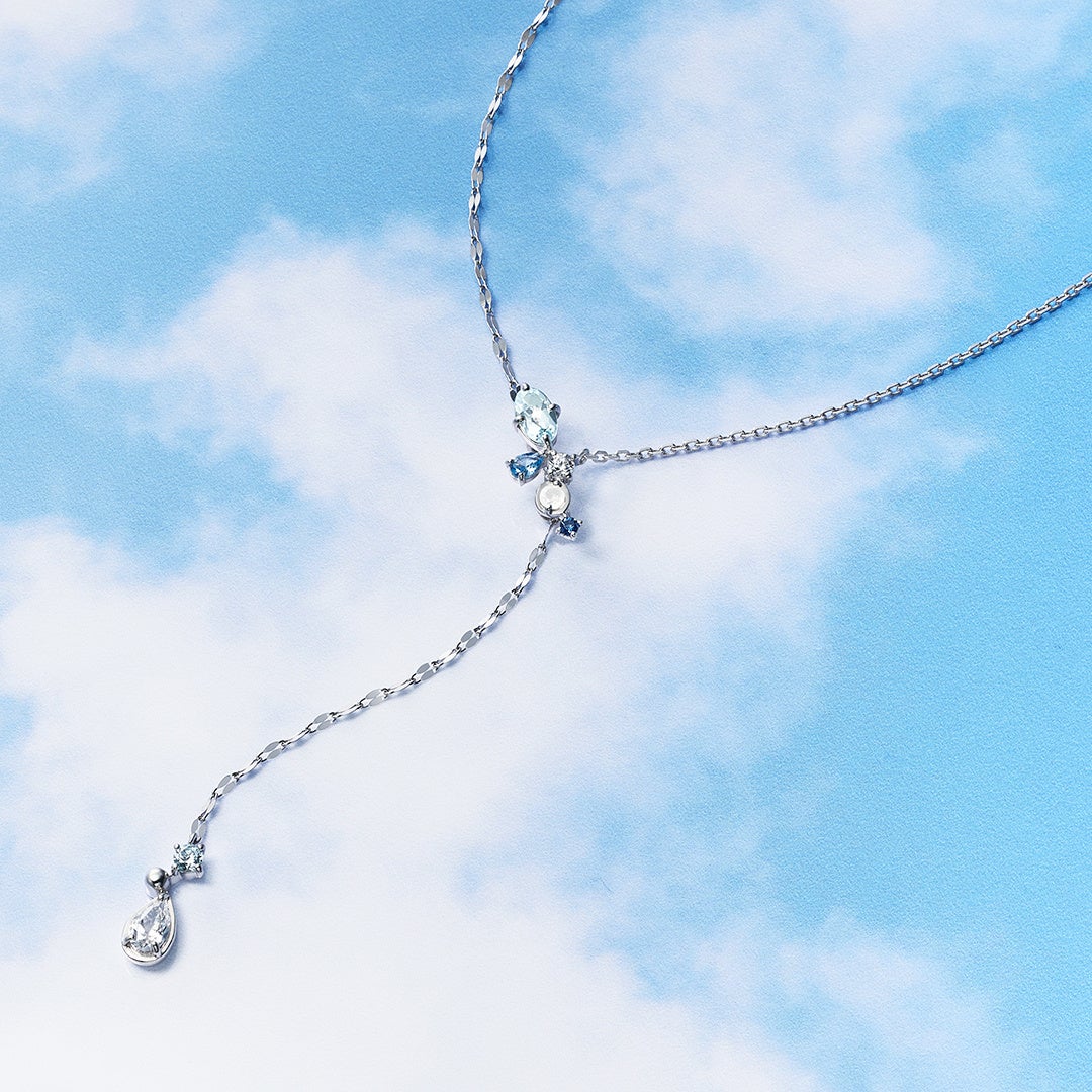 スカイブルートパーズで青い空に浮かぶ雲を表現したセットジュエリーや、海にきらめく水しぶきや水平線の輝きをイメージしたネックレス、イエローゴールドの地金にストーンが踊るように並ぶイヤーカフまで、清涼感あふれるジュエリーをご用意しました。