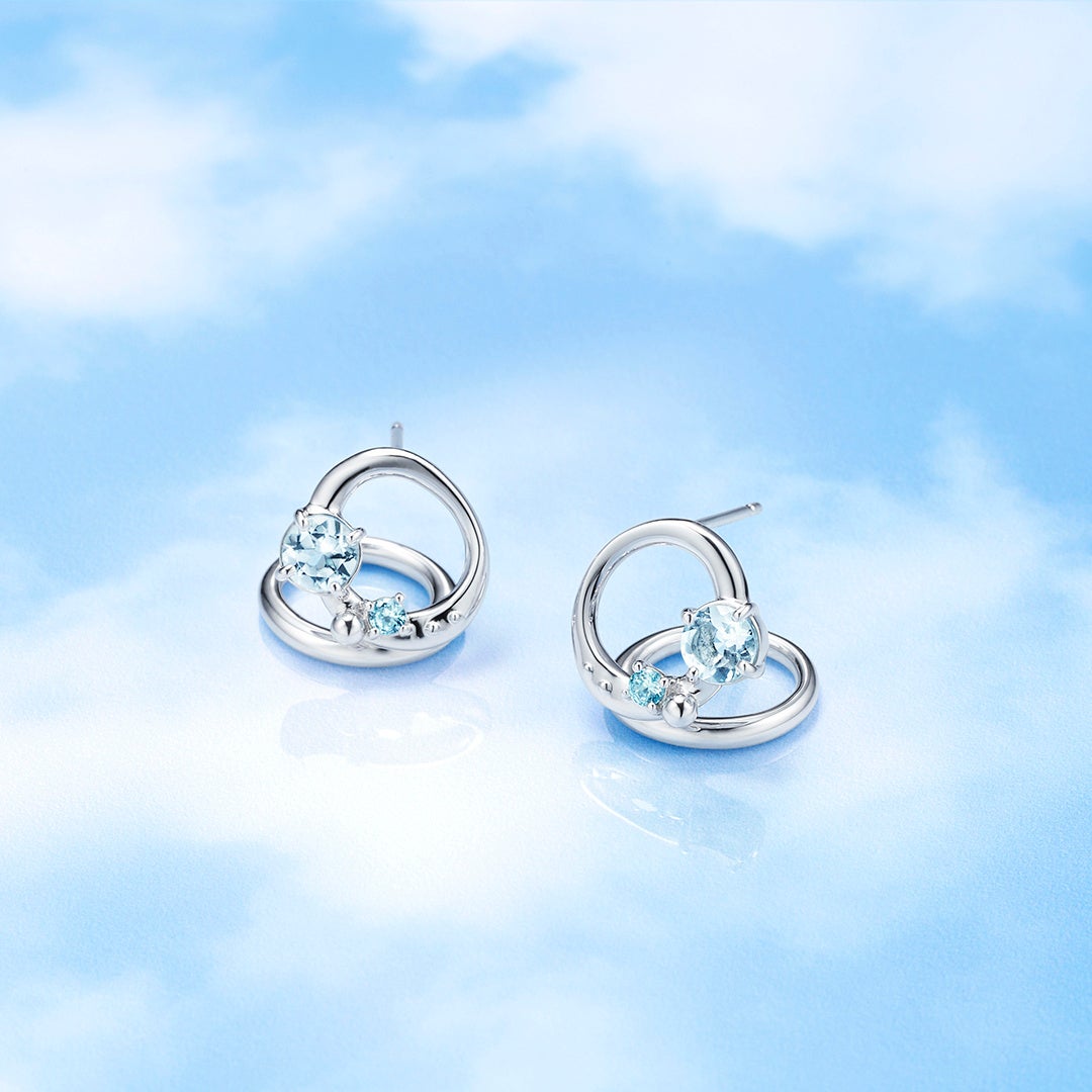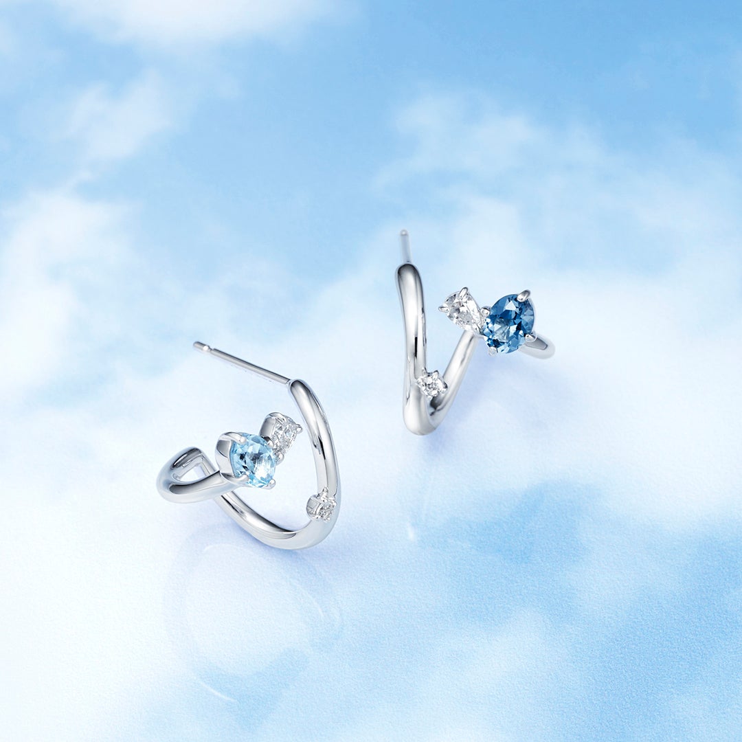 光に反射する泡を、ランダムなストーンやボールのセッティングで表現した「Bubble in Blue」。自由に揺らめき弾ける泡の一瞬の表情を切り取ったような、波打つ地金のラインが印象的。立体感のあるサークルを連ねたカフリングも、耳元に軽やかな輝きを添えます。