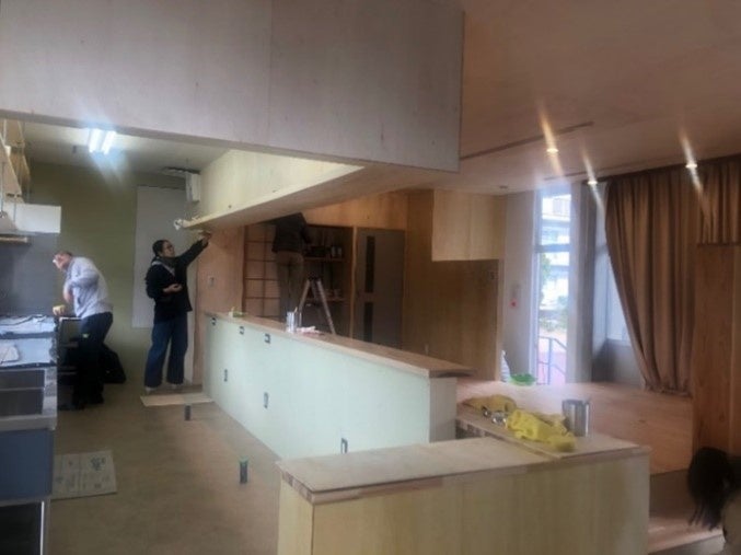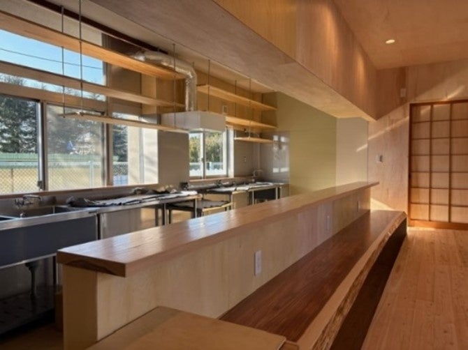 7棟集会所はフルリノベーションにより、高齢者も若者も立ち寄れ、好きなことができる多世代交流・多目的使用できる集会所として生まれ変わります。広い厨房とカウンターを備えたキッチンはシェアキッチンとしても使用できます。また、ちょっとした日用品を買えるミニマーケットでの助け合いの場、様々な方の仕事・交流・チャレンジ・学びの場となることをめざしています。