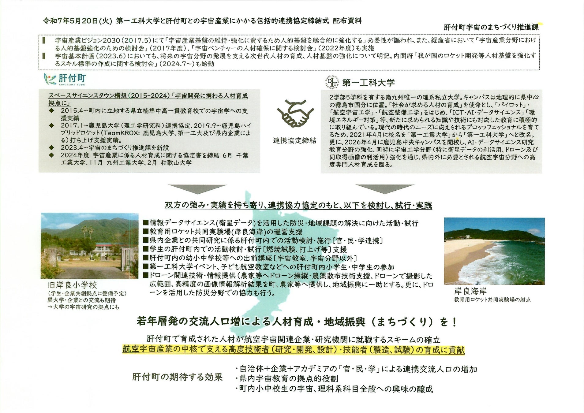 第一工科大学(鹿児島県霧島市、学長:都築 明寿香)は、5月20日(火)に、肝付町との宇宙産業に係る人材育成に関する包括的連携協定を締結いたしました。本学と自治体との連携は、鹿児島県霧島市、岐阜県各務原市に続き、3例目となります。