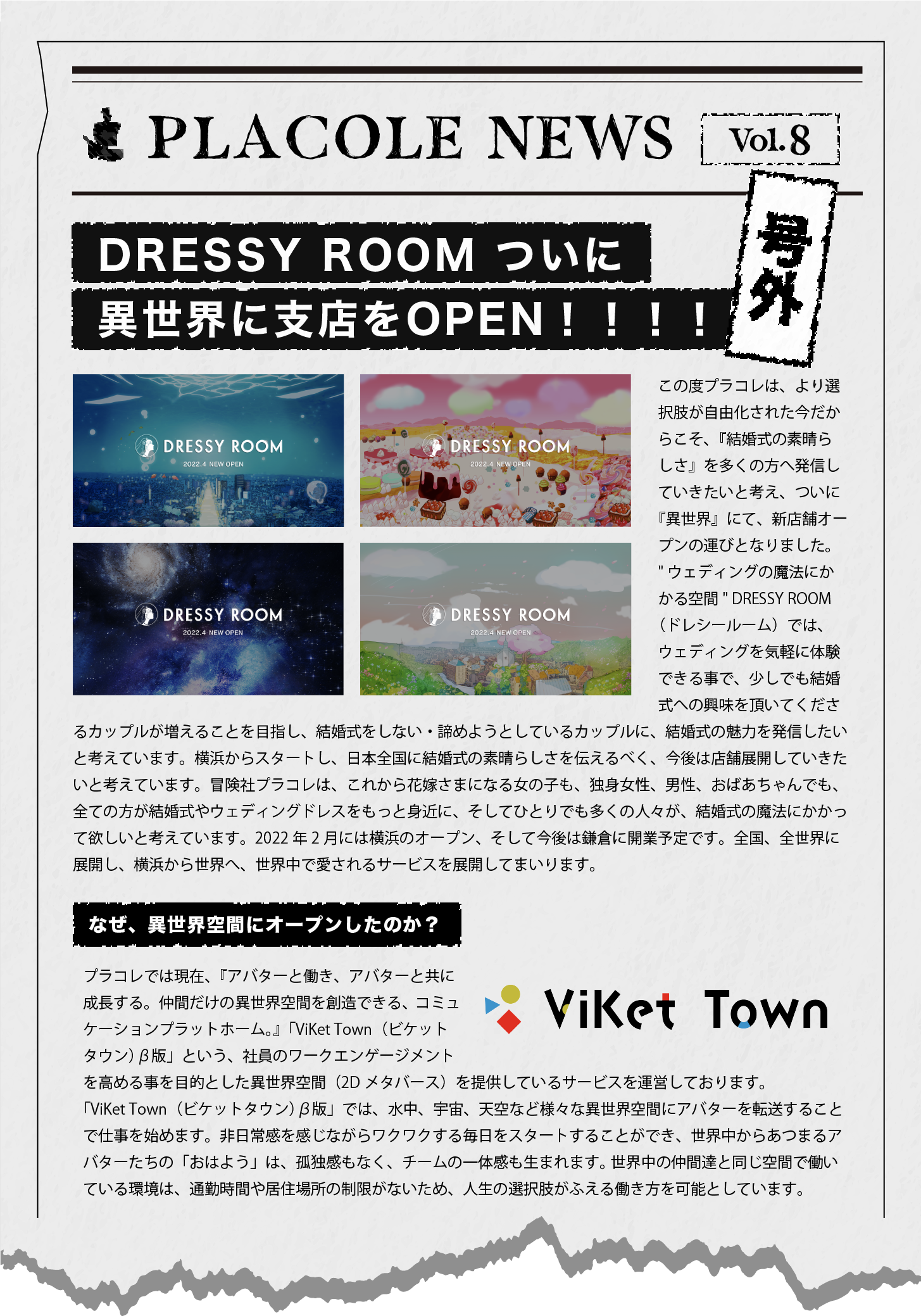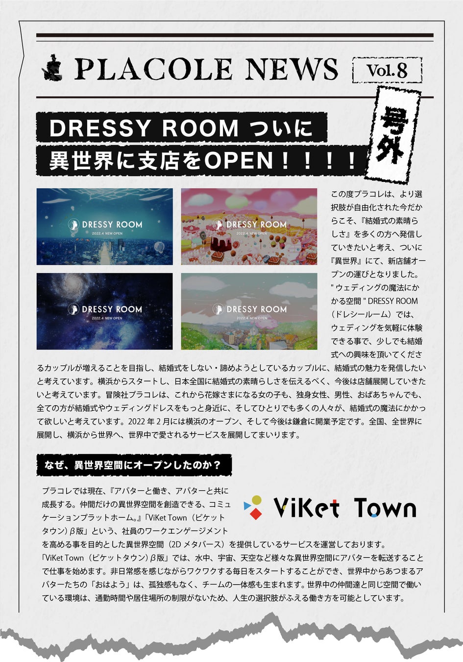 この度プラコレは、より選択肢が自由化された今だからこそ、『結婚式の素晴らしさ』を多くの方へ発信していきたいと考え、ついに『異世界』にて、新店舗オープンの運びとなりました。 "ウェディングの魔法にかかる空間" DRESSY ROOM(ドレシールーム)では、ウェディングを気軽に体験できる事で、少しでも結婚式への興味を頂いてくださるカップルが増えることを目指し、結婚式をしない・諦めようとしているカップルに、結婚式の魅力を発信したいと考えています。横浜からスタートし、日本全国に結婚式の素晴らしさを伝えるべく、今後は店舗展開していきたいと考えています。冒険社プラコレは、これから花嫁さまになる女の子も、独身女性、男性、おばあちゃんでも、全ての方が結婚式やウェディングドレスをもっと身近に、そしてひとりでも多くの人々が、結婚式の魔法にかかって欲しいと考えています。