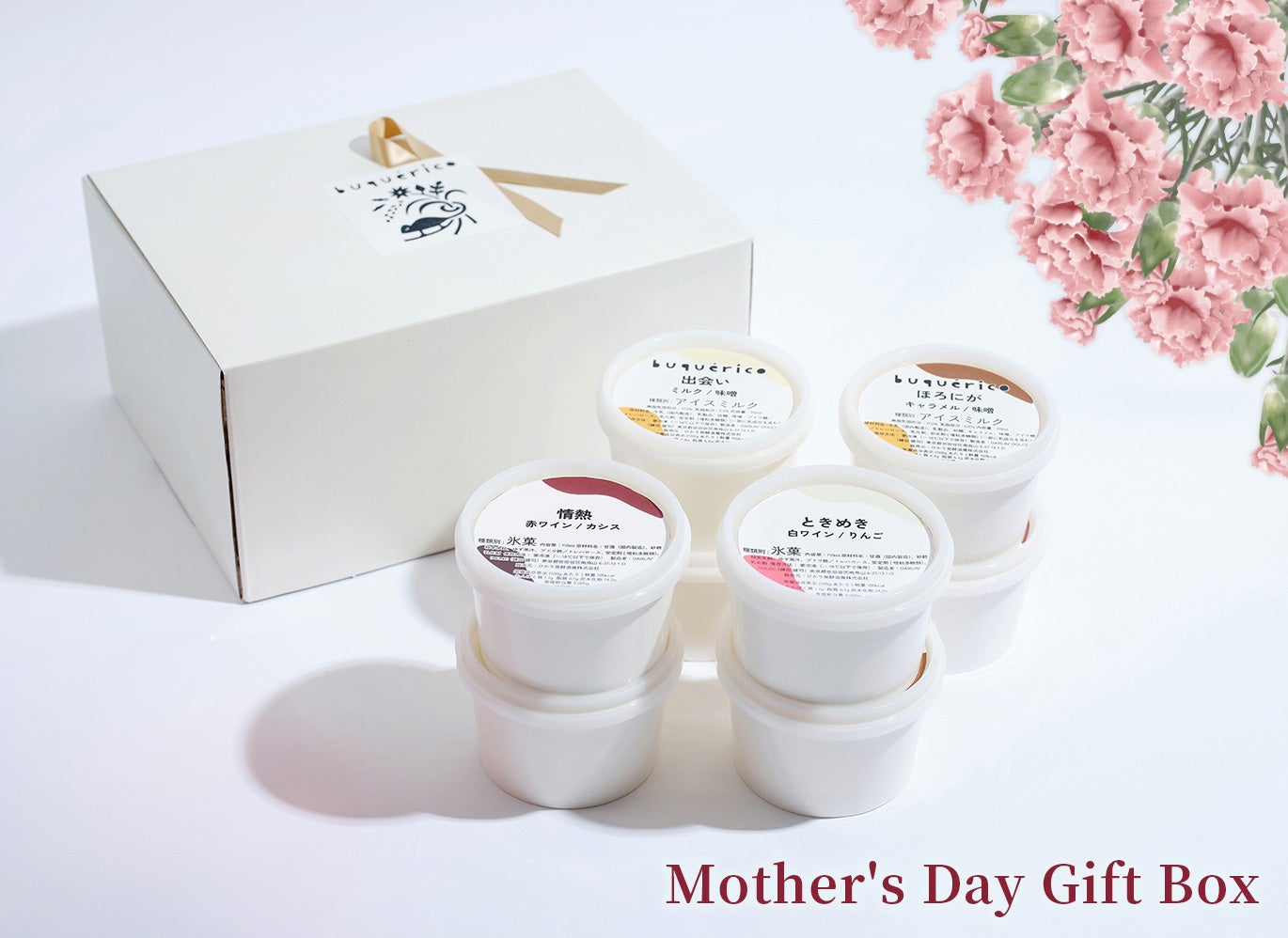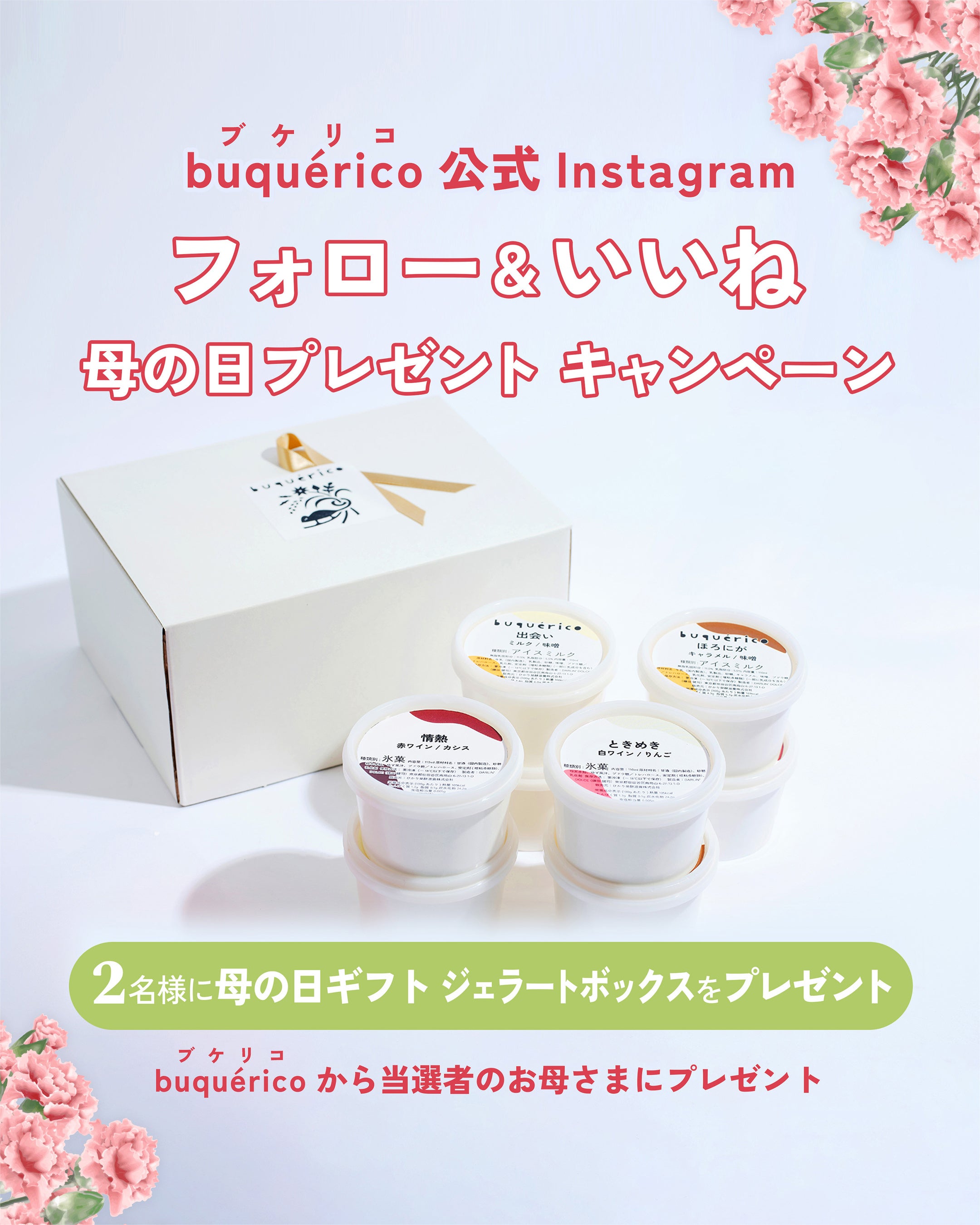 ご参加いただいた方の中から抽選で2名様にbuquéricoの「gelato」より「情熱 赤ワイン/カシス」「ときめき 白ワイン/りんご」「出会い ミルク/味噌󠄀」「ほろにが キャラメル/味噌󠄀」を各2個、合計8個をセットにした、期間限定販売の「母の日ギフト ジェラートボックス」をプレゼントいたします。