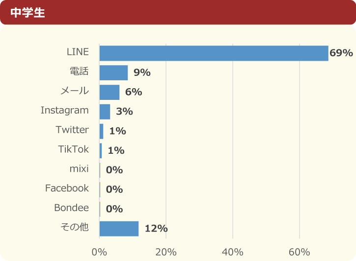 2022年の回答(注1)でも「LINE」で連絡を取り合っている人が最多でした。2022年は全体で47%、小学生で39%、中学生で66%だったので、全体的に増えていることがわかりました。