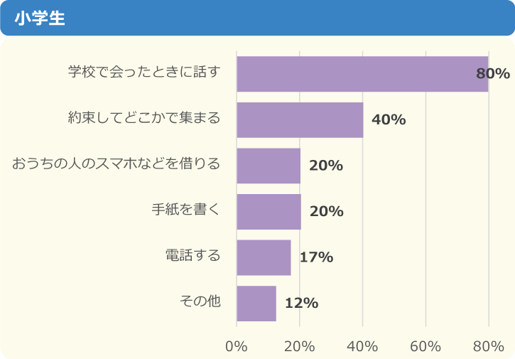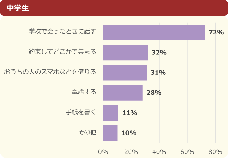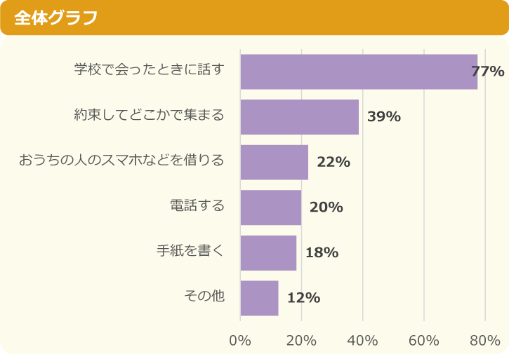 最も多かった回答は「学校で会った時に話す」で、全体の77%でした。小学生も中学生も3位までは同じ順でしたが、4位以下が異なりました。