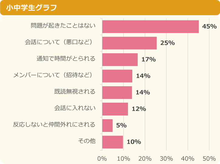 LINEなどのSNSで友だち同士のグループチャットに入っているかという質問には、「入っている」と答えた小学生が35%で、中学生は62%でした。グループチャットでの問題については、「問題は起きたことがない」が45%で最多でした。「会話について(悪口など)」「通知に時間がとられる」「メンバーについて(招待など)」との回答が上位となりました。