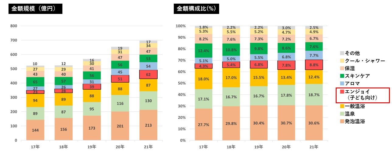 コロナ禍を契機に“おうち時間”のQOLを高める入浴剤のニーズは高まっており、入浴剤市場の拡大が続いています。なかでも「子ども向け」入浴剤市場は年々拡大しており、2021年の金額規模は2017年比で約2.7倍と大幅に伸長。入浴時間は、親子のコミュニケーション機会の一つとして価値が高まってきていることが伺えます。