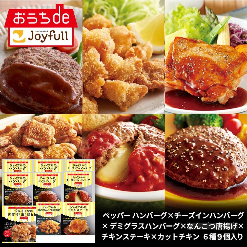 ●ジョイフルのハンバーグ(てりやきソース・ペッパー付き)2個 ●ジョイフルのハンバーグ(デミグラスソース付き)2個 ●ジョイフルのチーズインハンバーグ(トマトソース付き)2個 ●ジョイフルの鶏のなんこつ唐揚げ1個 ●ジョイフルの味付け<生>鶏もも肉 1個 ●ジョイフルのチキンステーキ 1個