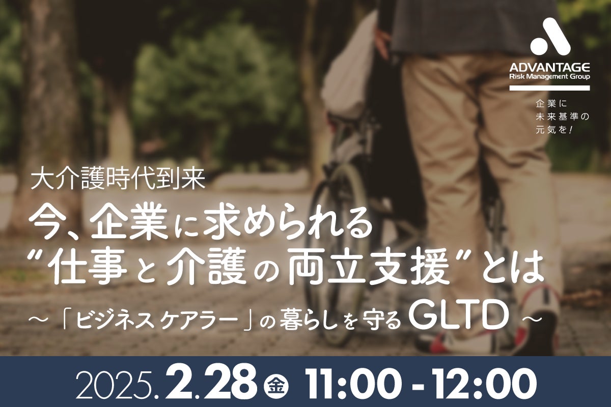 株式会社アドバンテッジリスクマネジメントは、2025年2月28日(金)に人事労務/福利厚生/人事企画のご担当者様・責任者様を対象としたWebセミナー「今、企業に求められる“仕事と介護の両立支援”とは~『ビジネスケアラー』の暮らしを守るGLTD~」を開催いたします。本セミナーはGLTD、中でも介護特約の戦略的活用方法について重点的にお話をさせていただきます。