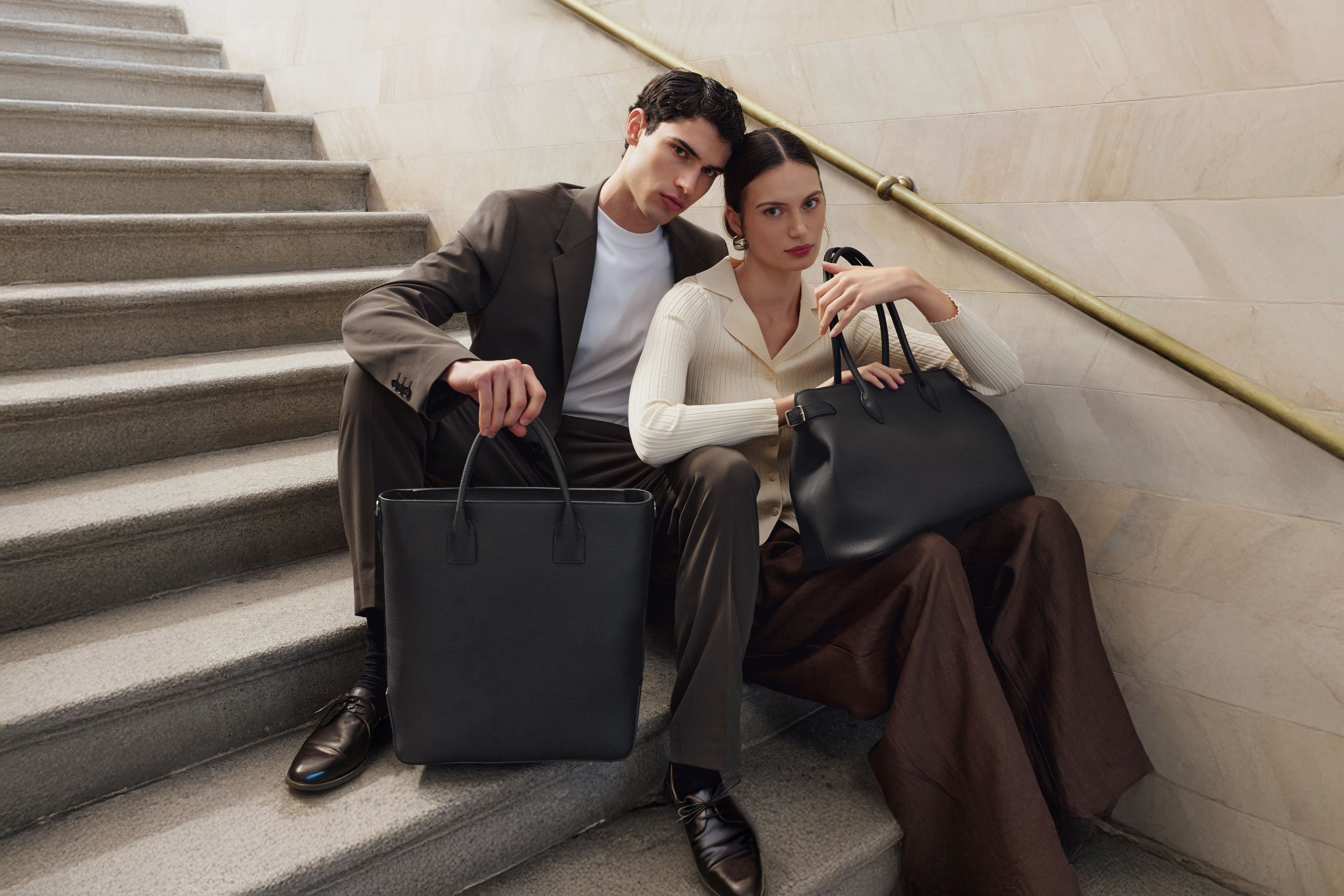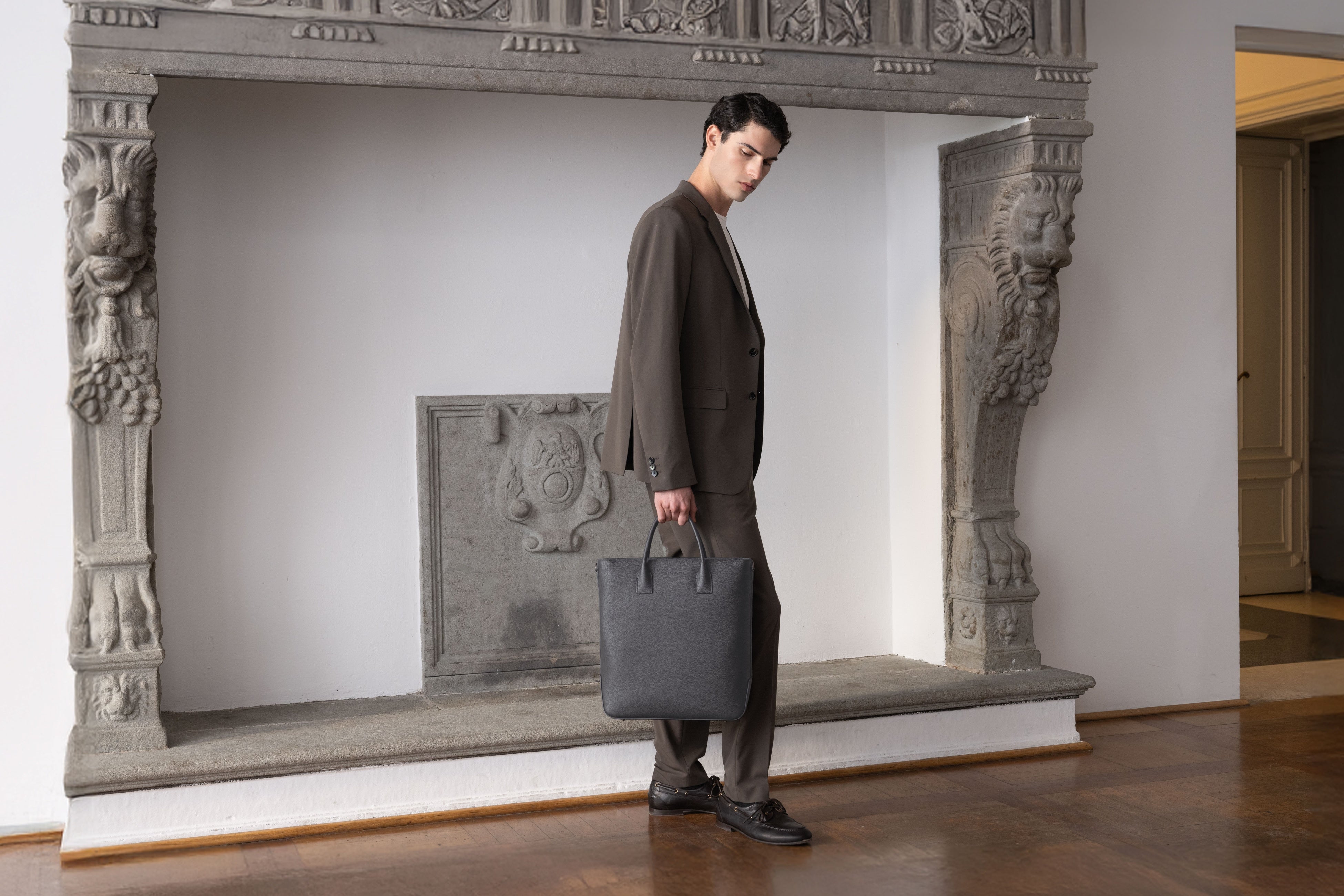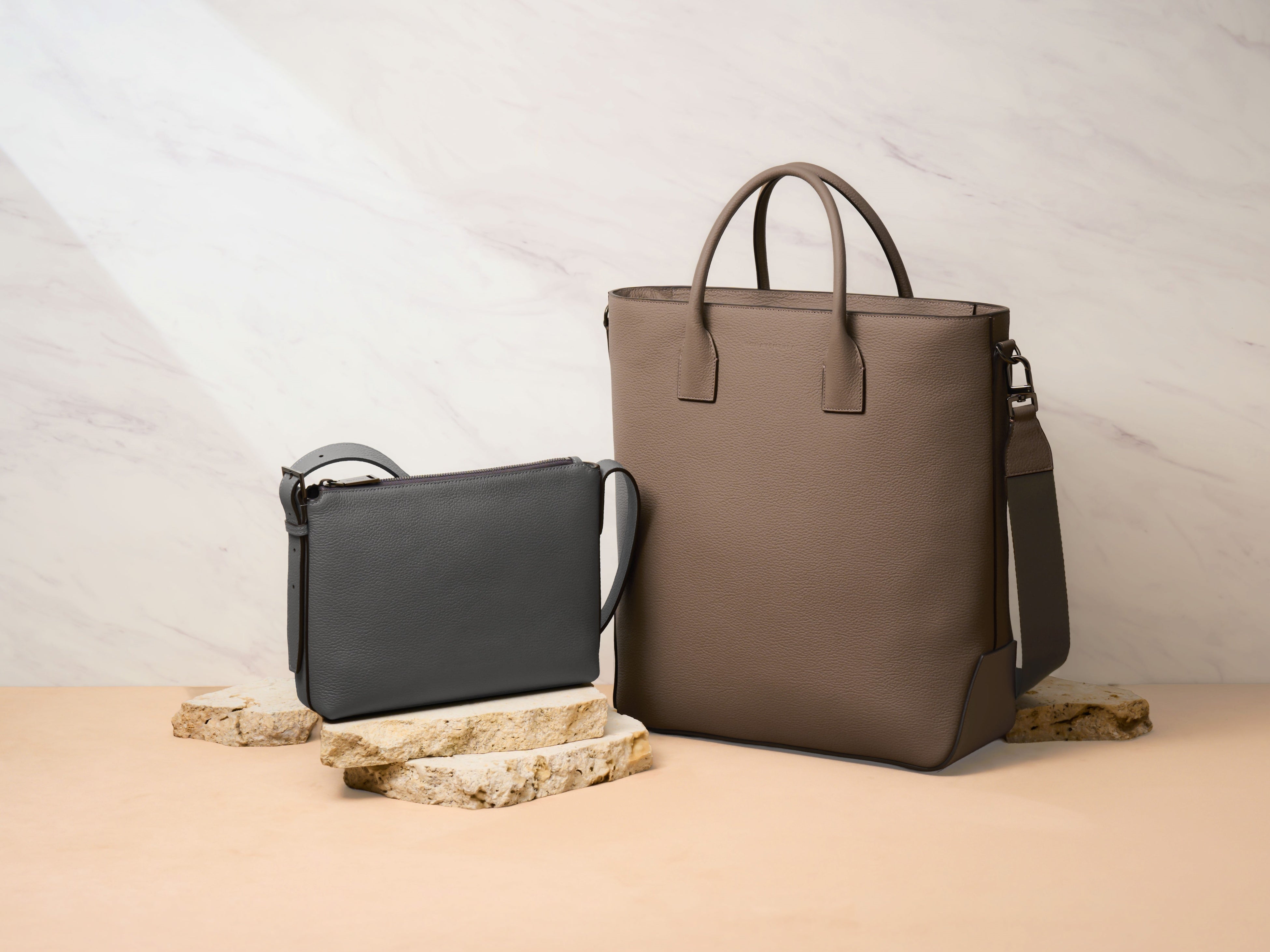 内装に柔らかなスエード素材を採用したトートバッグは、PCや大切な持ち物を優しく保護する仕様に加え、5つの底鋲による自立性や型崩れしにくい張りのあるレザーが魅力です。また、本体からストラップまでシュリンクレザーを贅沢に使用したショルダーバッグは、500mlのペットボトルを横向きに収納できるなど、スマートな佇まいながら優れた収納力を備えています。