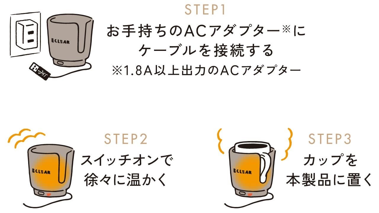 本製品をお手持ちのACアダプターに接続することでマグカップや紙コップに入れた飲み物を保温できるカップウォーマー“エクリア ウォーム カップウォーマー”です。
