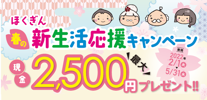 北陸銀行(頭取 庵 栄伸)では、この春新たなスタートを切られる社会人・学生の皆さまを対象に、2022年2月1日(火)より「ほくぎん春の新生活応援キャンペーン2022」を実施いたします。新たに「給与振込」を当行に指定されるお客さまや「ほくぎんWeb口座」をお申し込みされるお客さまなどを対象に、最大で現金2,500円をプレゼントいたします。