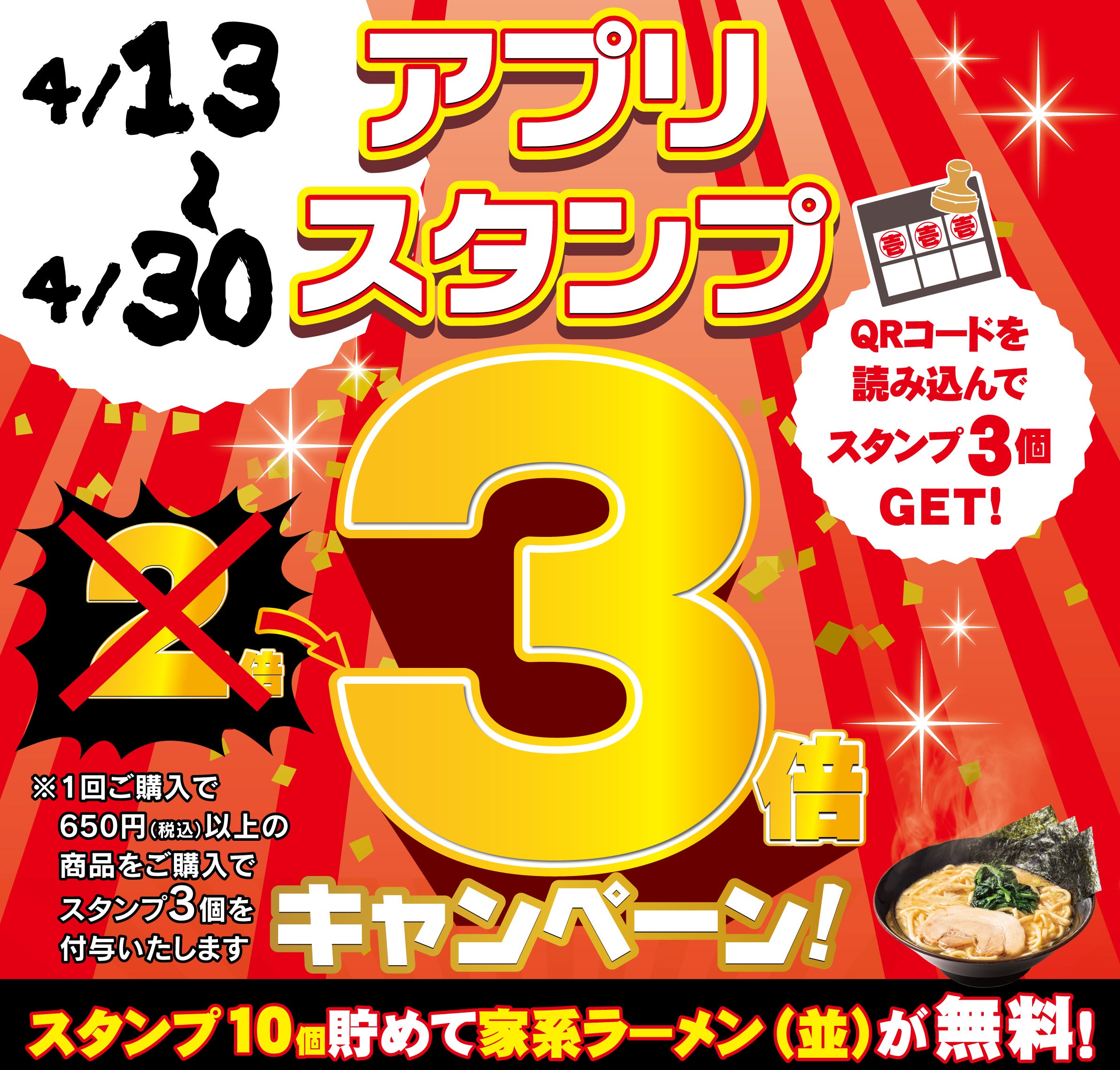 ・内容 :麺類もしくは丼類650円(税込)以上の商品をご購入でスタンプを3個付与。