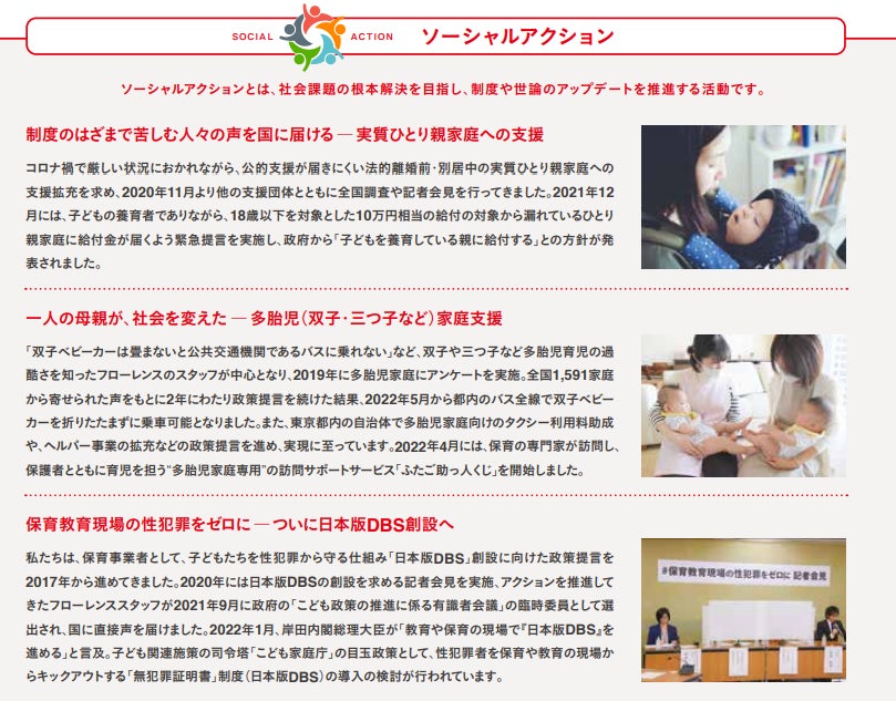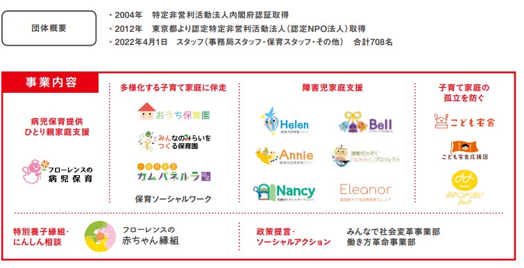 フローレンスは、2004年より国内の親子領域の社会課題解決をおこなう特定非営利活動法人です。保育や看護、ソーシャルワークなど現場での福祉支援に関わる専門職スタッフが547名、活動・事業をバックオフィスで支える事務系スタッフ193名、計740名(2022年10月現在正社員雇用人数)の団体で、国内NPO団体において最大規模の組織です。