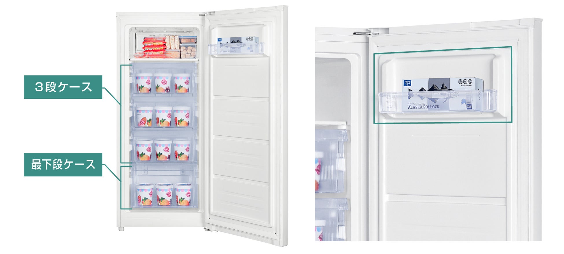 5段収納の最上段は仕切り棚で奥⾏が30cmあり、長さのある冷凍食品や作り置きを保存している容器などを収納できます。中3段は中が⾒やすいクリアカラーのケースで、引き出し式となっている為、収納した⾷品が取り出しやすくなっております。最下段のケースは大型で高さが約23cmある為、箱型のアイスのようなかさばる食品を保管することができます。扉にはドアポケットも配備されているので、アイスキャンディーや保冷剤など、厚みがなくすぐに取り出したいものの保管に便利な作りとなっております。