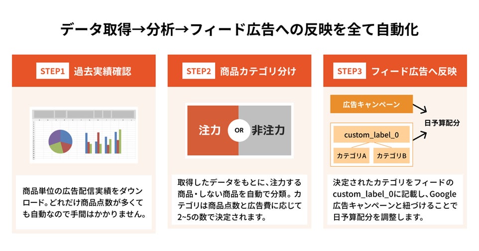 Googleは、2021年夏ごろからショッピング広告の「商品単位での広告最適化」を推奨しています。また、当社の保有データから、実際にGoogleの「スマートショッピングキャンペーン(※3)」を利用している50社を分析した結果、広告経由の売上が発生している商品は平均17%であることがわかりました。これらの「広告経由で売上につながる商品」に注力することで売上拡大が見込まれる一方で、数百点以上の商品を抱えるECサイトの場合、商品1点ごとに手動で予算調整を行うことは困難です。そこで当社は、これまでに蓄積された広告データとつちかってきた開発力を活かして商品単位での広告最適化を実現するAIを開発、EC向けフィード広告最適化サービス『フォーカセル』を提供開始しました。