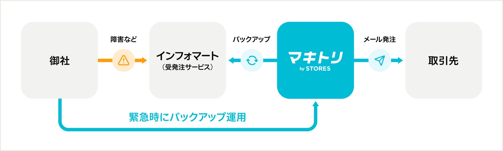 ・データ連携:発注プラットフォームから発注データを取得し、同プラットフォーム停止時に「マキトリ発注」より各取引先に発注情報をメールで連携(※インフォマート社の「BtoBプラットフォーム 受発注」に対応)