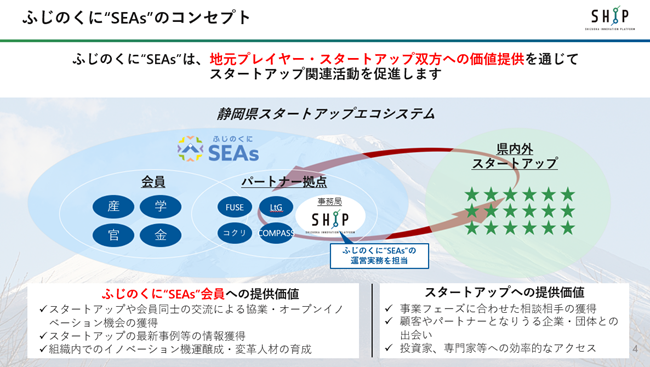 そのような中、この度、静岡県内外から産官学金の様々なプレイヤーが集まり、スタートアップを支援するコミュニティ「ふじのくに“SEAs”」が立ち上げられました(2月15日時点で75社・団体)。LTSが運営を担当しているSHIP(SHIZUOKA INNOVATION PLATFORM)が、ふじのくに“SEAs”