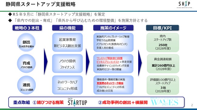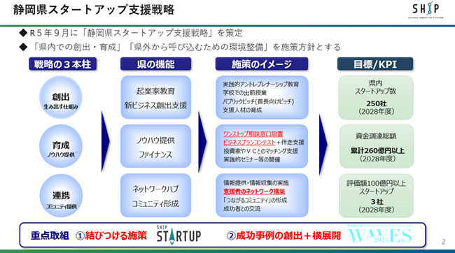 静岡県では、昨年9月に策定した「静岡県スタートアップ支援戦略」に基づき、様々なスタートアップ支援施策を本格的に展開しています。スタートアップを県内で育成・創出する、県外からスタートアップを呼び込むための環境を整備する、の2つを施策方針として、県内外のスタートアップから選ばれる地域を目指して様々な施策を推進しています。