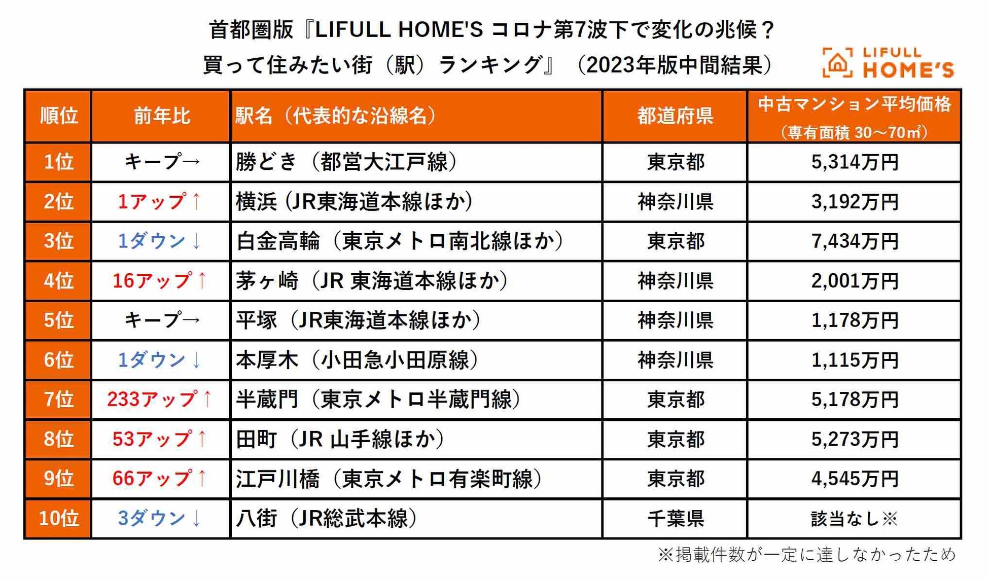 「勝どき」のほか、前回2位の「白金高輪」が暫定3位、「半蔵門」が233ランクアップの暫定7位と急上昇し、「田町」が同61位→暫定8位、「江戸川橋」も同75位→暫定9位と大きく順位を上げています。いずれも注目のマンション開発が行われているエリアであり、マンション開発エリアの最寄り駅が上位に進出しているという「勝どき」と同じ状況が発生しています。4位には16ランクアップした「茅ケ崎」、前回同率5位だった「平塚」「本厚木」もそれぞれ暫定5位、暫定6位と健闘しており、依然として首都圏郊外での人気も高く維持されています。
