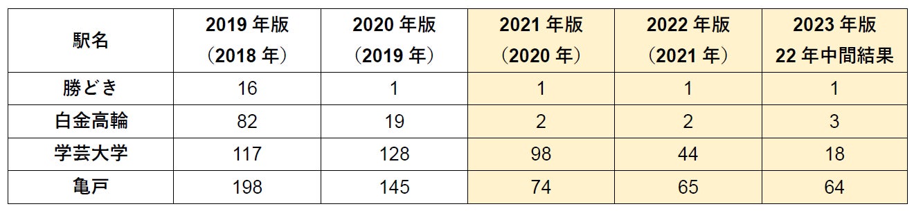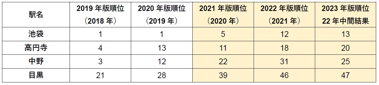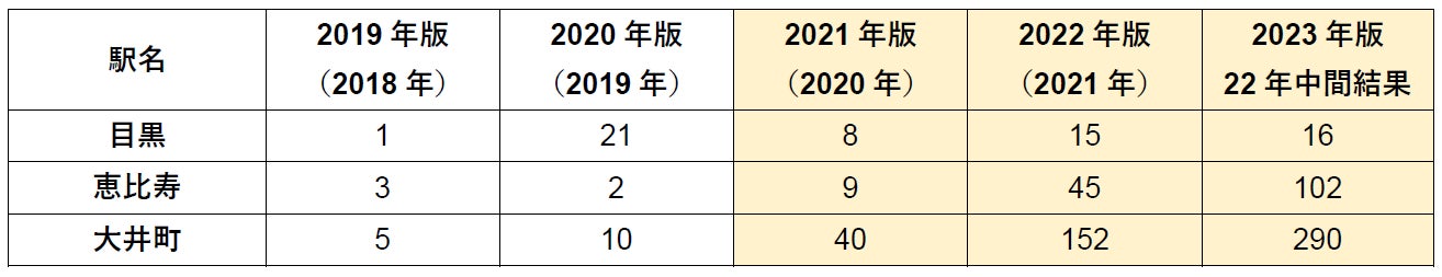 「目黒」はコロナ前の2019年版(2018年調査)では1位を獲得していますが、その後21位→8位→15位→暫定16位と順位を落としており、「恵比寿」も同3位→暫定102位、「大井町」同5位→暫定290位と急激な順位低下が発生しています。これは駅周辺での比較的大規模なマンション開発が終了し、販売も完了したことから注目度が下がり、これにコロナの影響も重なったものと考えられます。