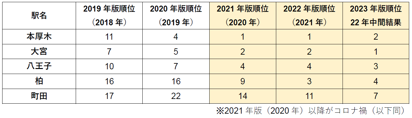 コロナ禍で2年連続1位の「本厚木」を僅差で抑えた「大宮」が暫定トップ