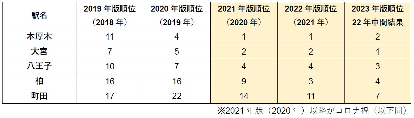 「大宮」はコロナ前の2019年以降、7位→5位→2位→2位→暫定1位とコロナ禍に入ってからベスト3に躍進し、「本厚木」も11位→4位→1位→1位→暫定2位とコロナ禍でトップをうかがう位置を確保しています。他にも「八王子」は2019年の10位→暫定3位、「柏」は2019年の16位→暫定4位、「町田」同17位→暫定7位とコロナ前と比べ大きく順位を上げていますが、これらの街(駅)はいずれも駅勢圏が広く、生活利便性が確保されているという共通点があります。また都心へもダイレクトにアクセス可能で、たまに通勤するにも便利な駅ばかりです。