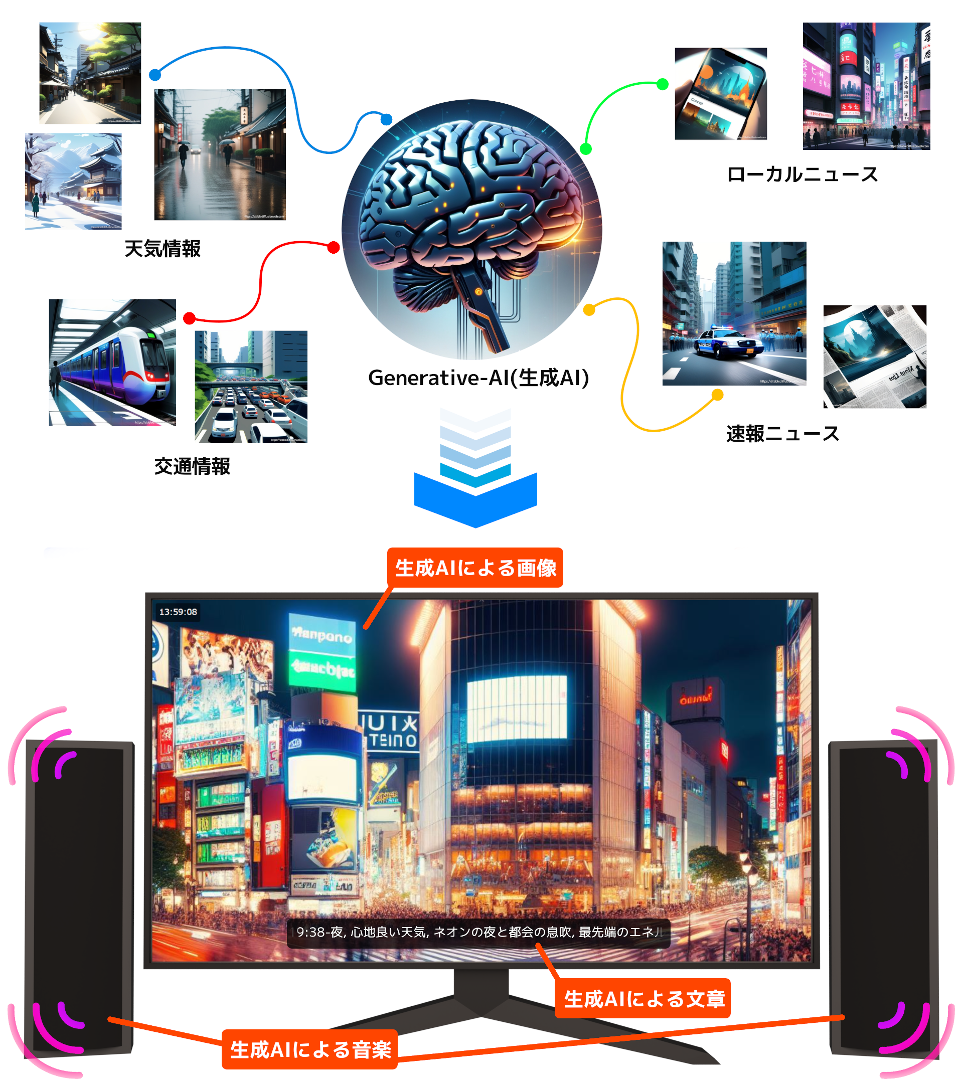 ■生成AIによる環境情報をもとにした感性表現温度、湿度、風向、天気、人の流れ、ニュースなど街の情報を収集し、生成AIにより感性的な画像、音楽を再生します。このデモは、AIの能力を活かして、視覚と聴覚の両面で魅力的な体験を提供します。例えば、晴れた日には明るく陽気なイメージと楽曲を、雨の日には静かでメランコリックなものを生成し、人々に感性的な街の状況を楽しんでもらいます。