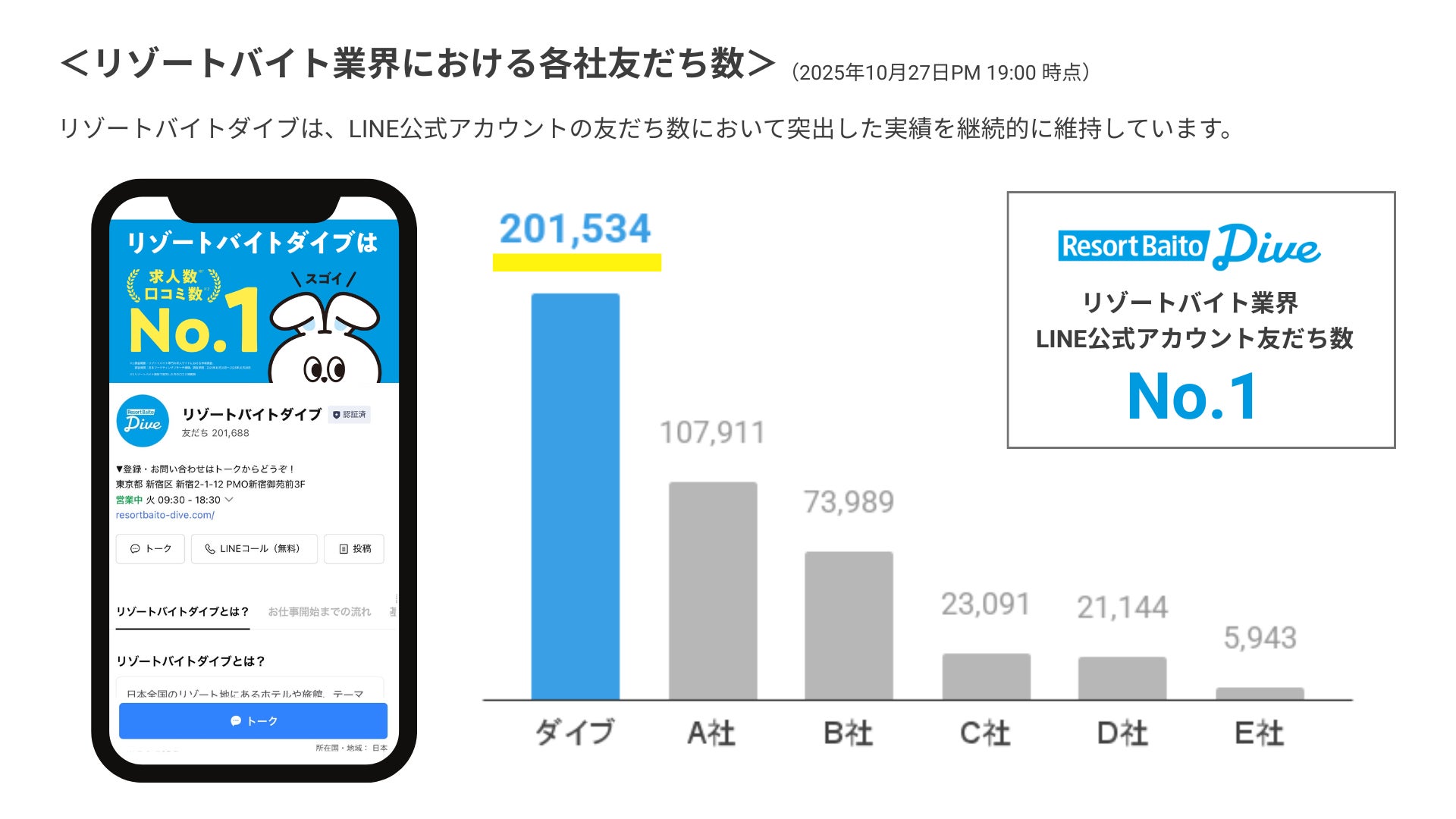 LINE公式アカウントを活用する企業が増える中、リゾートバイトダイブは、リゾートバイト業界において、LINE公式アカウントの友だち数がNo.1です。