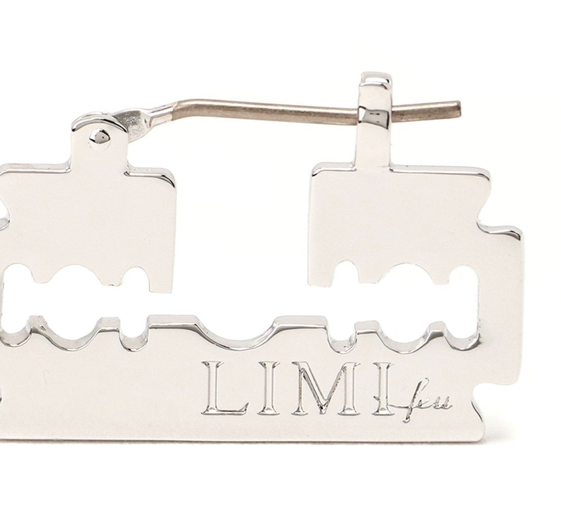 ブレードの横長フォルムに遮断機のイメージを重ね合わせた両耳兼用のピアス。中央のくり抜かれた部分に耳たぶを通して装着完了。リミ フゥのロゴ面とヨシコ クリエーションのロゴ面を選んでつけることが可能。
