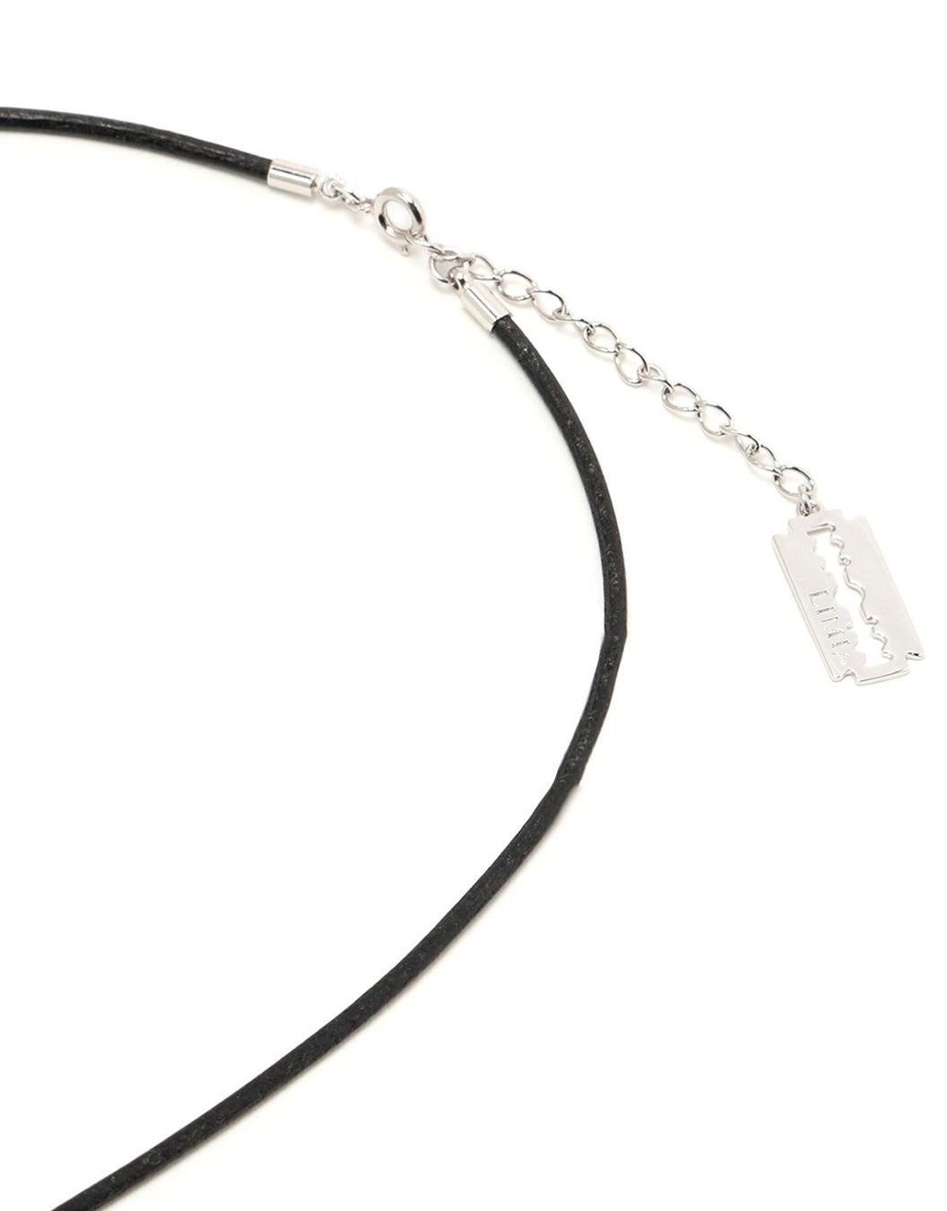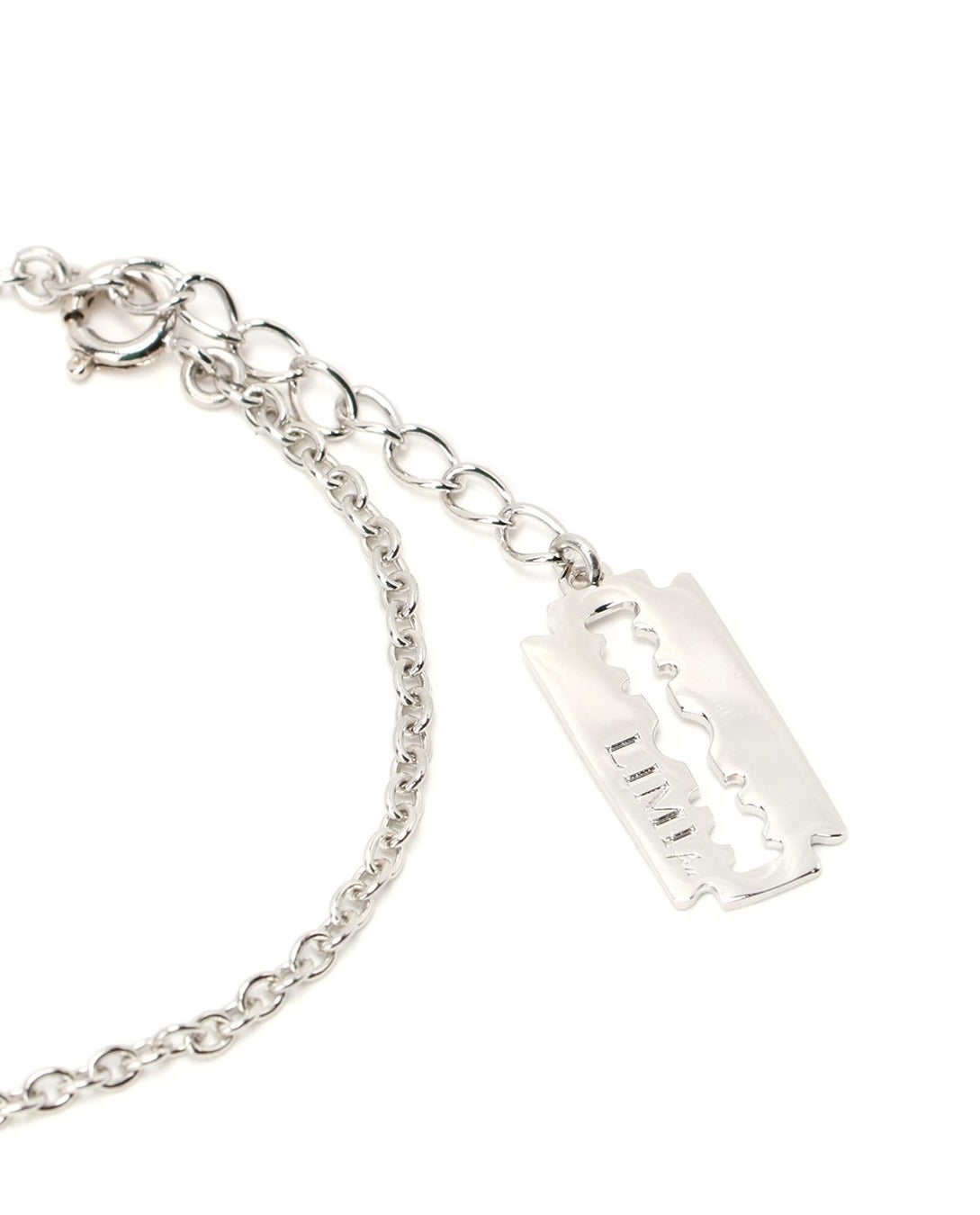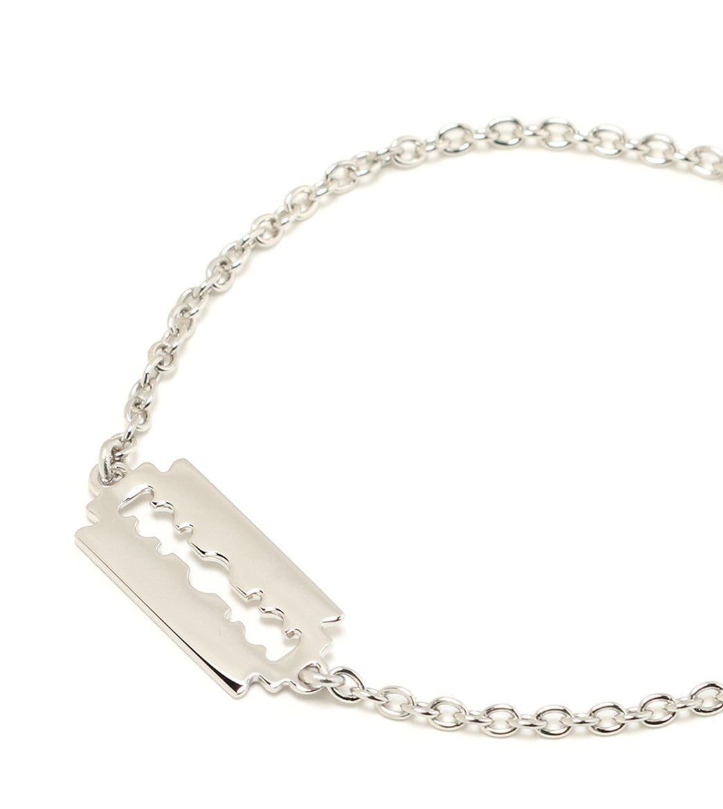 カミソリのイメージと相反するほど華奢でエレガントなブレスレット。アジャスター・チャームにはブランドのロゴを各面に刻印。シンプルなオーバーサイズシャツとのスタイリングが今夏らしい。