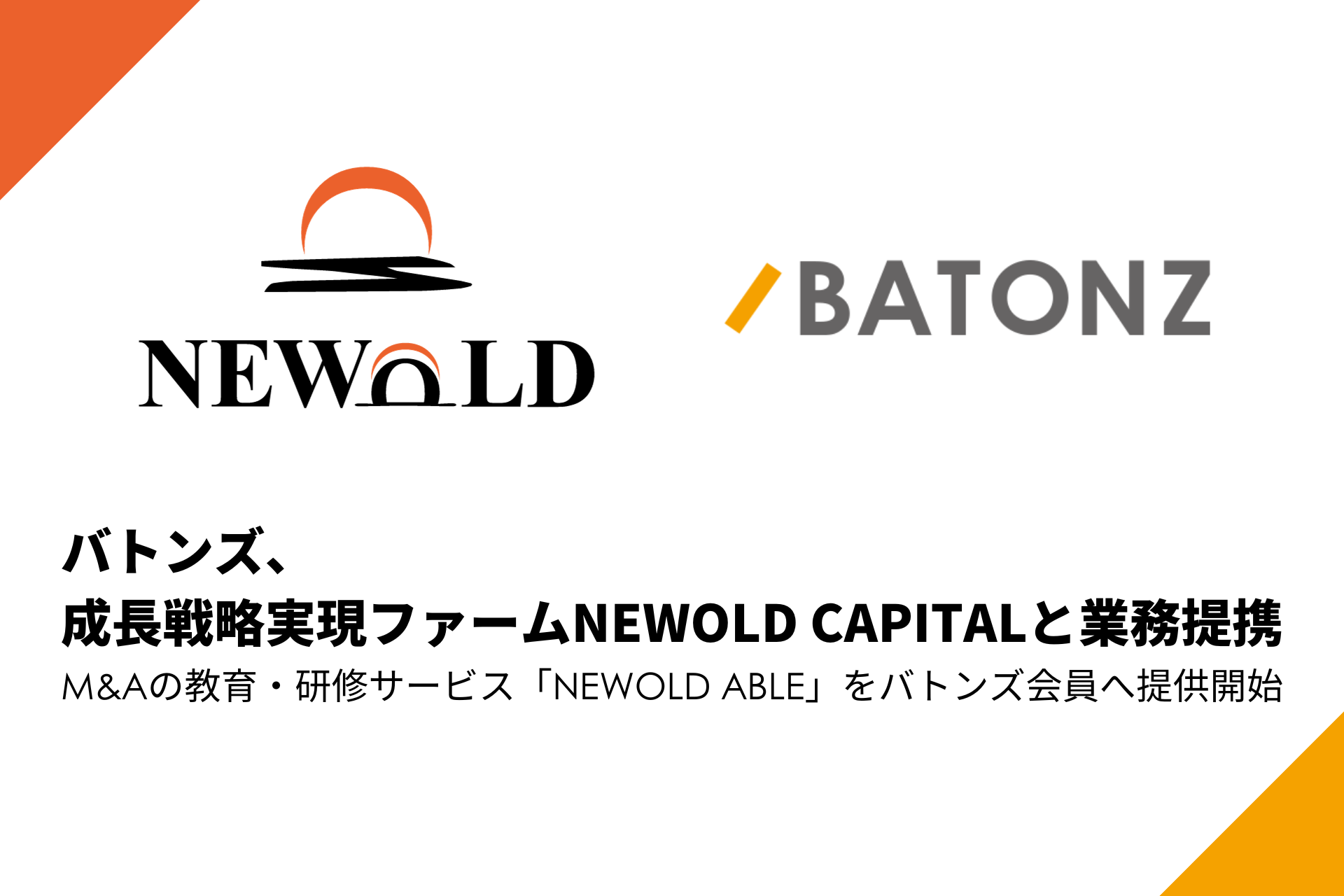 バトンズは、NEWOLDの「M&Aの確かな知識とノウハウを世に広めたい」という想いに共感し、バトンズに登録している買い手及びM&Aアドバイザーに対してNEWOLDが自社制作しているM&Aの教育・研修サービス「NEWOLD ABLE(ニューオールド・エイブル)」の提供を開始します。