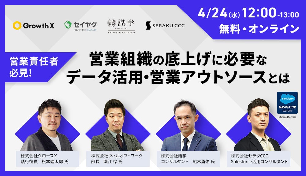 企業の営業組織においては、営業の再現性を高めていきたいが、属人化した営業手法から抜け出せないといった課題を抱える企業は多いのではないでしょうか。本セミナーでは、営業組織の課題解決を得意とするグロースX社、識学社、セラクCCC社、ウィルオブ・ワークの4社の担当者が登壇し、営業組織を底上げする為に必要な営業アウトソース、人材育成、SalesforceをはじめとするSFA・CRMのデータ活用における教育やマネジメントをテーマに、各社のリアルな視点でディスカッションします。